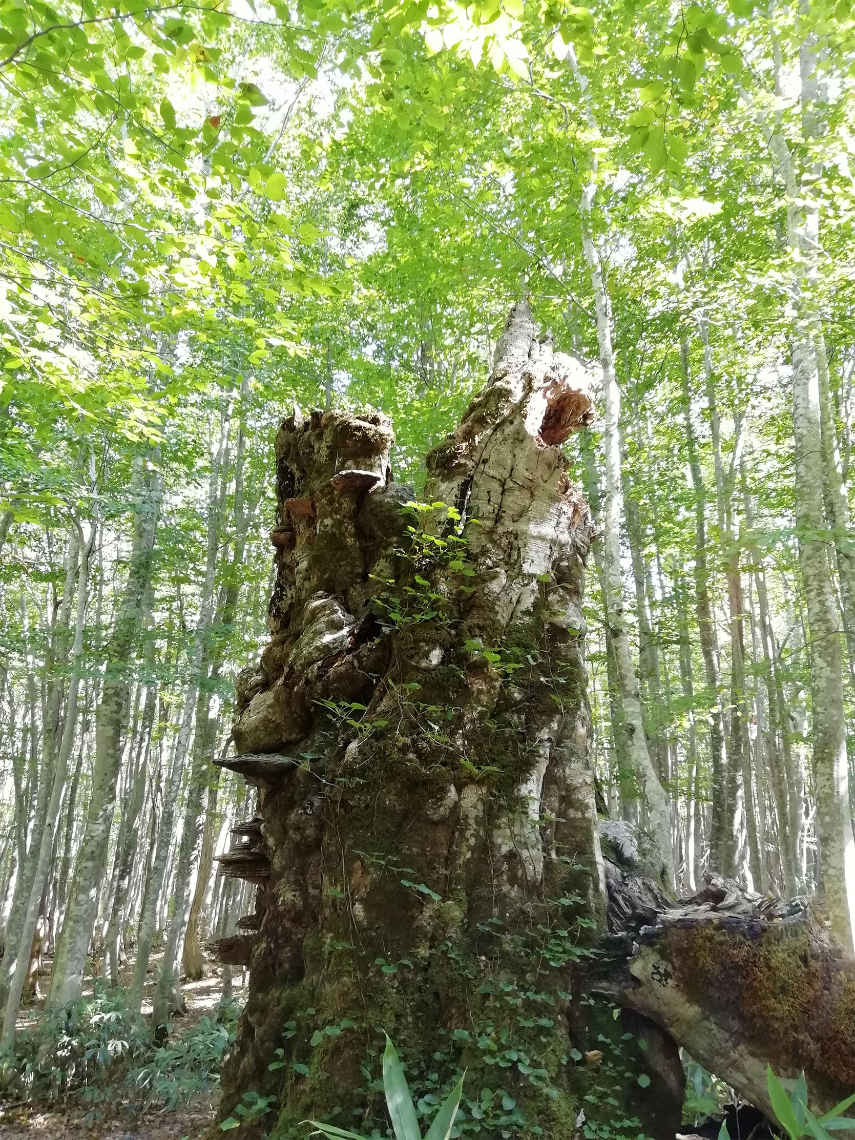 ススキ野の小道を進んでいくと、また白い木肌が輝くブナ林に入る。その先には、200年の樹齢を誇る、朽ち果てたマザーツリーがあった。その木の洞には苔が生え、新たな生命が宿っている。完全にジブリの世界で、神聖な場所にいるような気持ちになった。