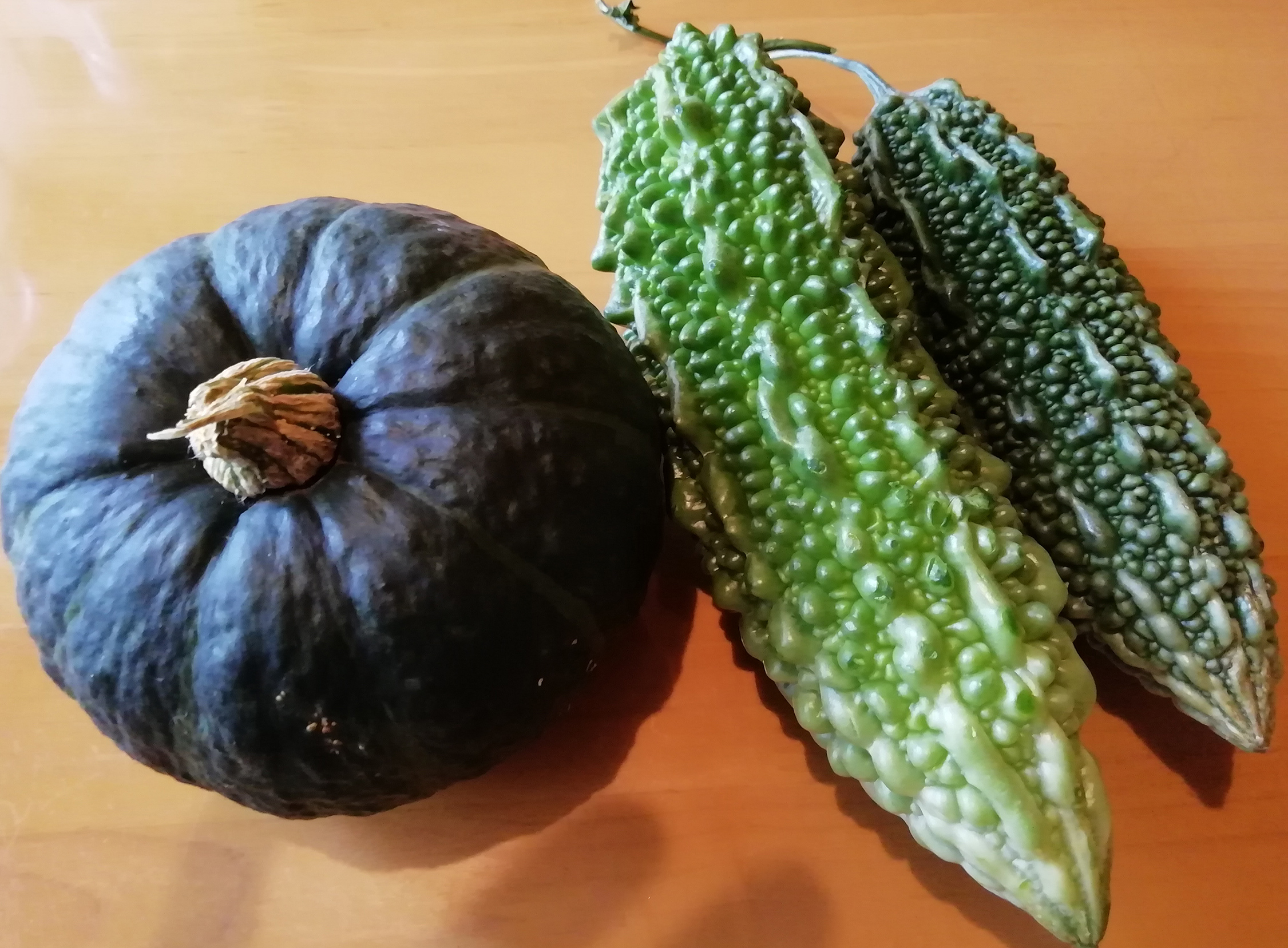 へー、面白いなあと話を聞いていたら、店番をしていた若い女の子が唐突に「ところでお兄さん、ゴーヤいる?」。一瞬戸惑ったけど、ゴーヤは好きだ。「いただきます」と答えたら、素敵な笑顔で「カボチャは好き?」と聞かれた。「はい、好きです」と言うと、どういう流れか、ゴーヤ2本とカボチャひとつをもらうことになった。お店に足を踏み入れてから、3分ぐらいの出来事である。