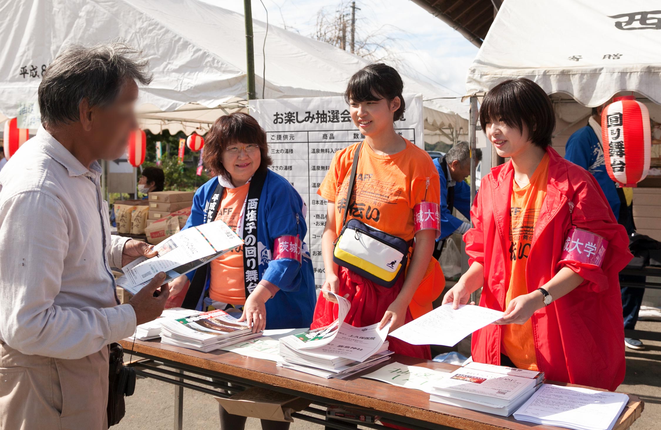 まずはこの歌舞伎の手伝いをしている、茨城大学「西塩子の回り舞台手伝い」というチームのブースに立ち寄った。今日の祭りを案内してくれる茨城大学人文社会科学部の西野由希子教授と学生たちだ。中国の現代文学が専門の西野先生は、市民との読書会「ブックカフェ」を定期的に行うなど、外国文学を通じた生涯教育にも力を注いでいる。だが文学者である西野先生が、里山で農村歌舞伎のボランティアをするようになったのは、なぜなのだろうか。