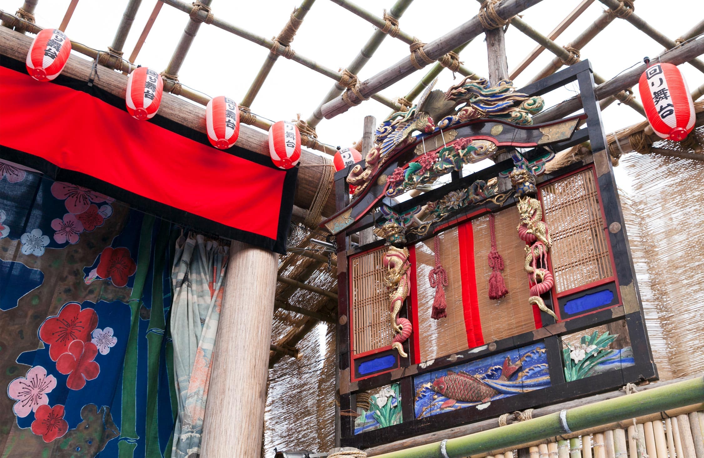 「西塩子の回り舞台」とは、江戸時代後期から常陸大宮市西塩子地区に持ち伝えられてきた、農村歌舞伎のための組立式の舞台だ。舞台の中央を円く切り抜いてあり、回すことができる。この回り舞台や、花道の床板などの部材のほか、舞台道具や古文書なども持ち伝えられており、現存する日本最古の「組立式農村歌舞伎舞台」として茨城県の有形民俗文化財に指定されている。今も使われている舞台の大幕には文政3年(1820)と書かれているのだ。