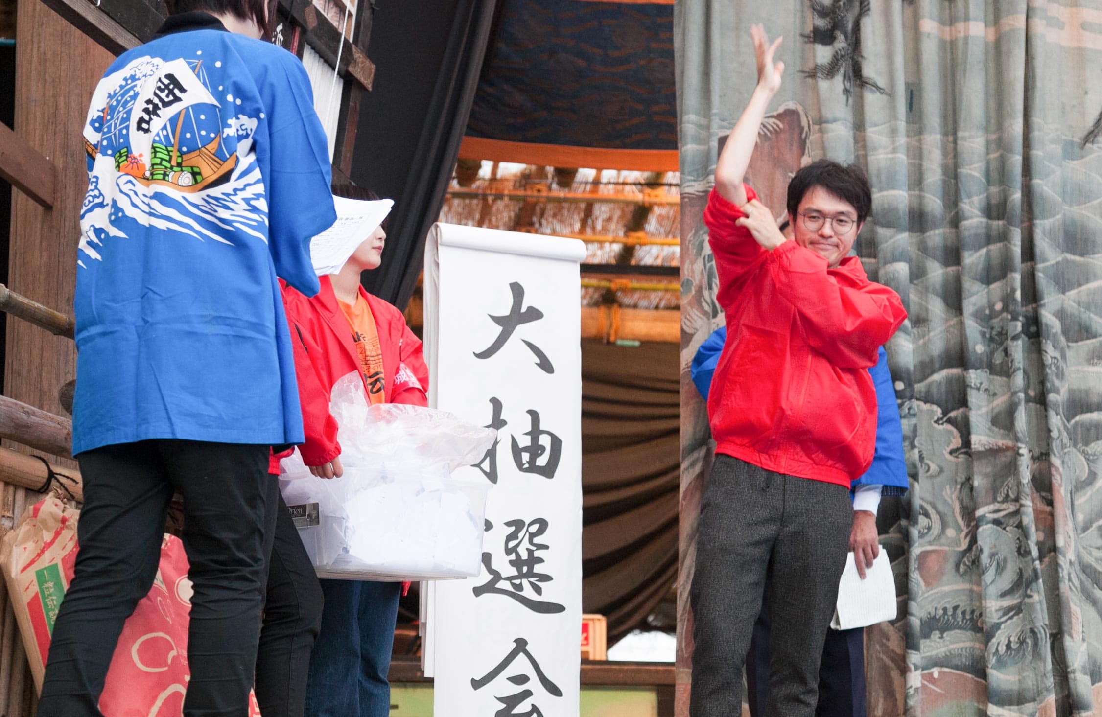さて、幕間のたびに行われている「お楽しみ抽選会」では、この祭りに関わるさまざまな人たちがくじひき役として壇上にあがるのだが、常陸大宮市地域おこし協力隊として、二年前に都会からこの町にやってきた松原功さんもその一人だ。