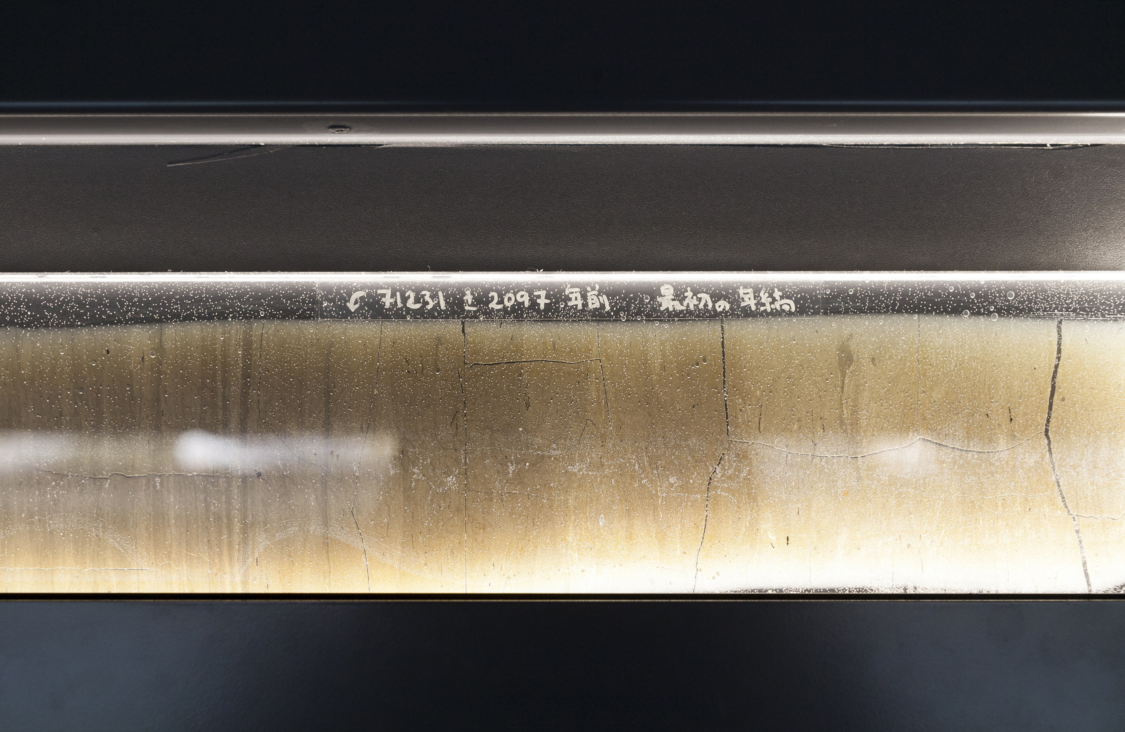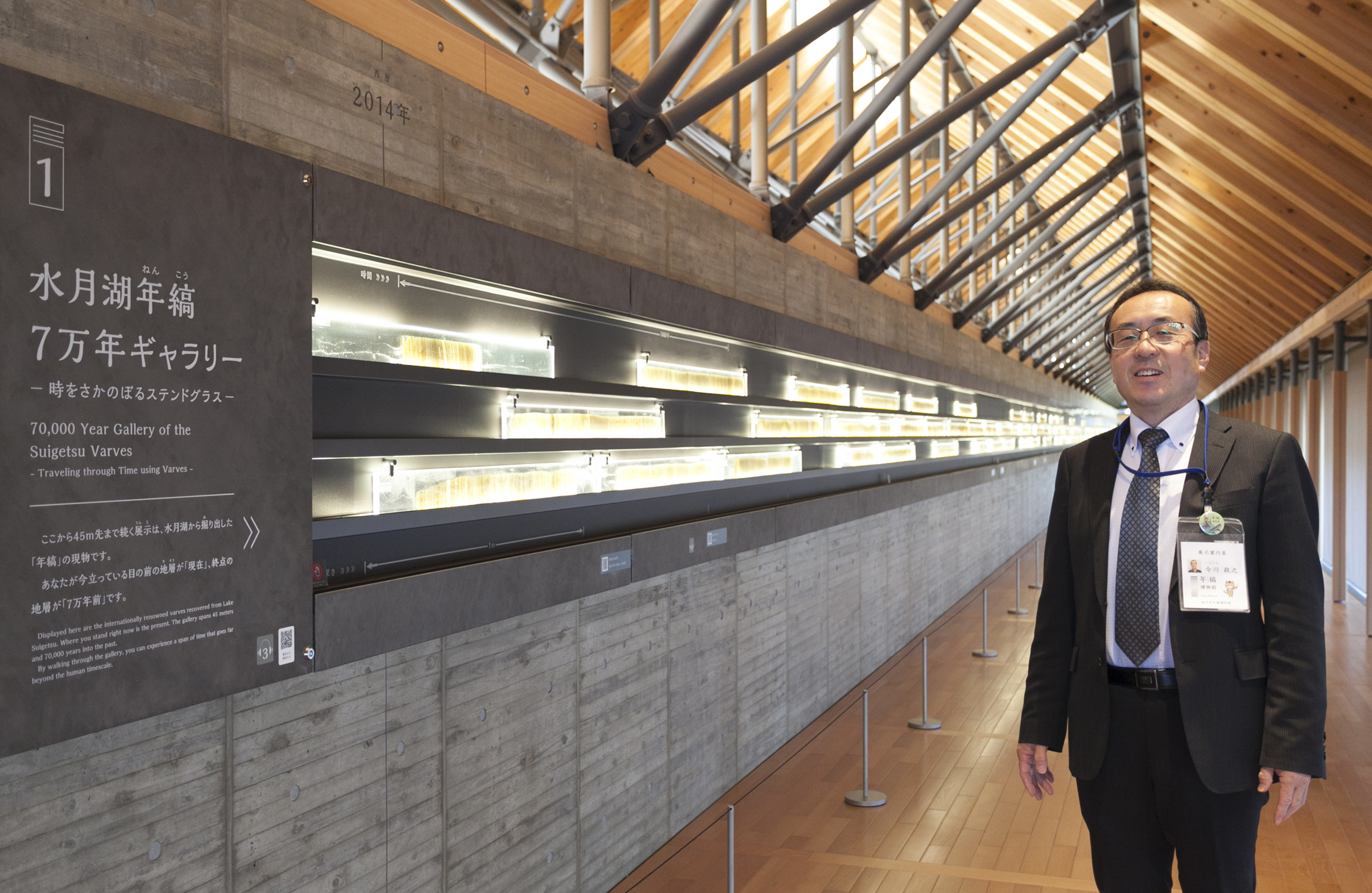 今川さんと一緒に、この博物館の目玉である実物の年縞を見る。45メートルの年縞は薄くスライスされて特殊なステンドグラスとして加工されている。そして2017年から7万年前までの全ての年縞が展示されているのだ!