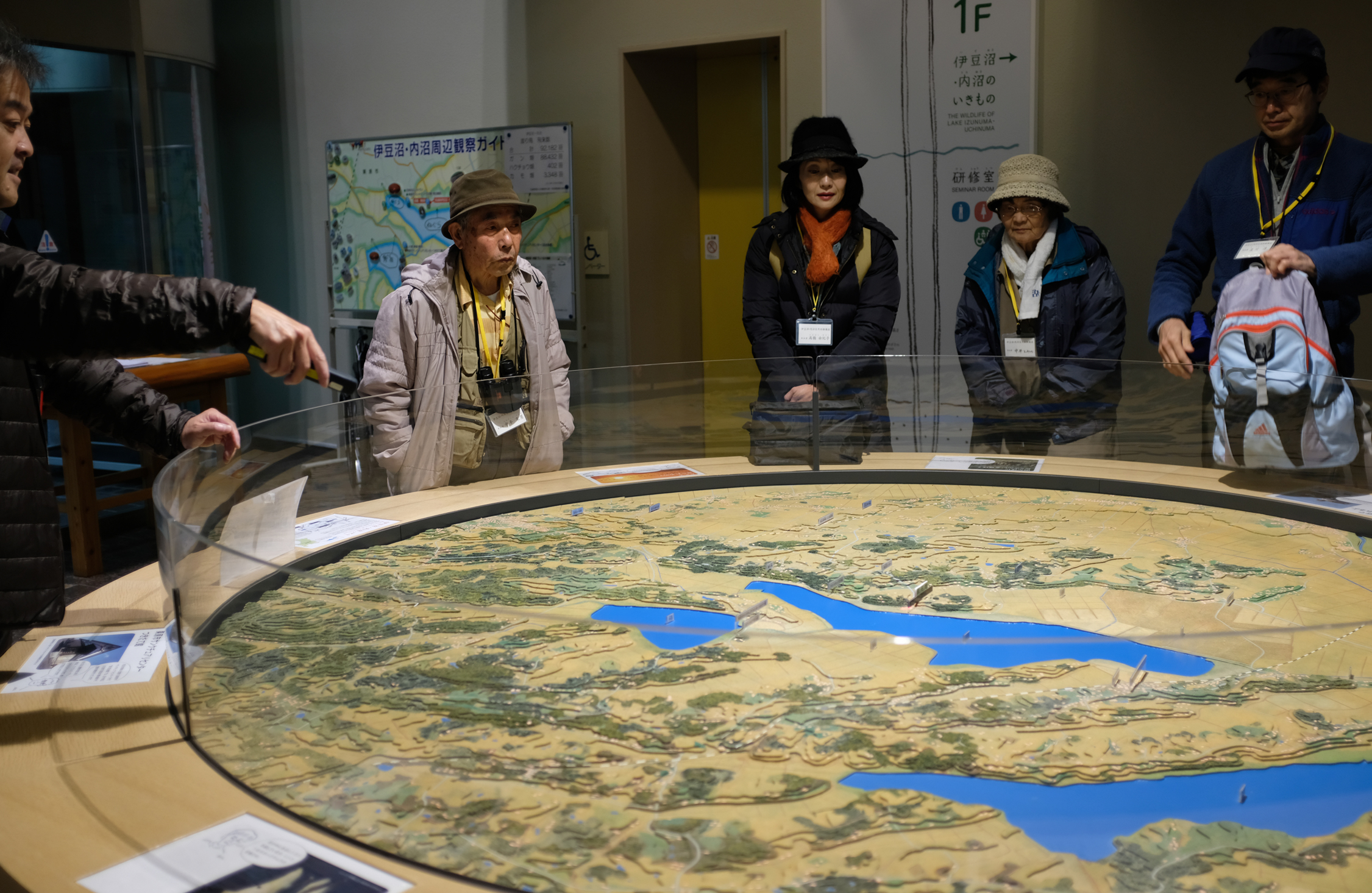 サンクチュアリセンターからバスで数分の場所にある観察スポットに行く前に、簡単なレクチャー。地図を見ながらこれから行く場所について教えてもらう。