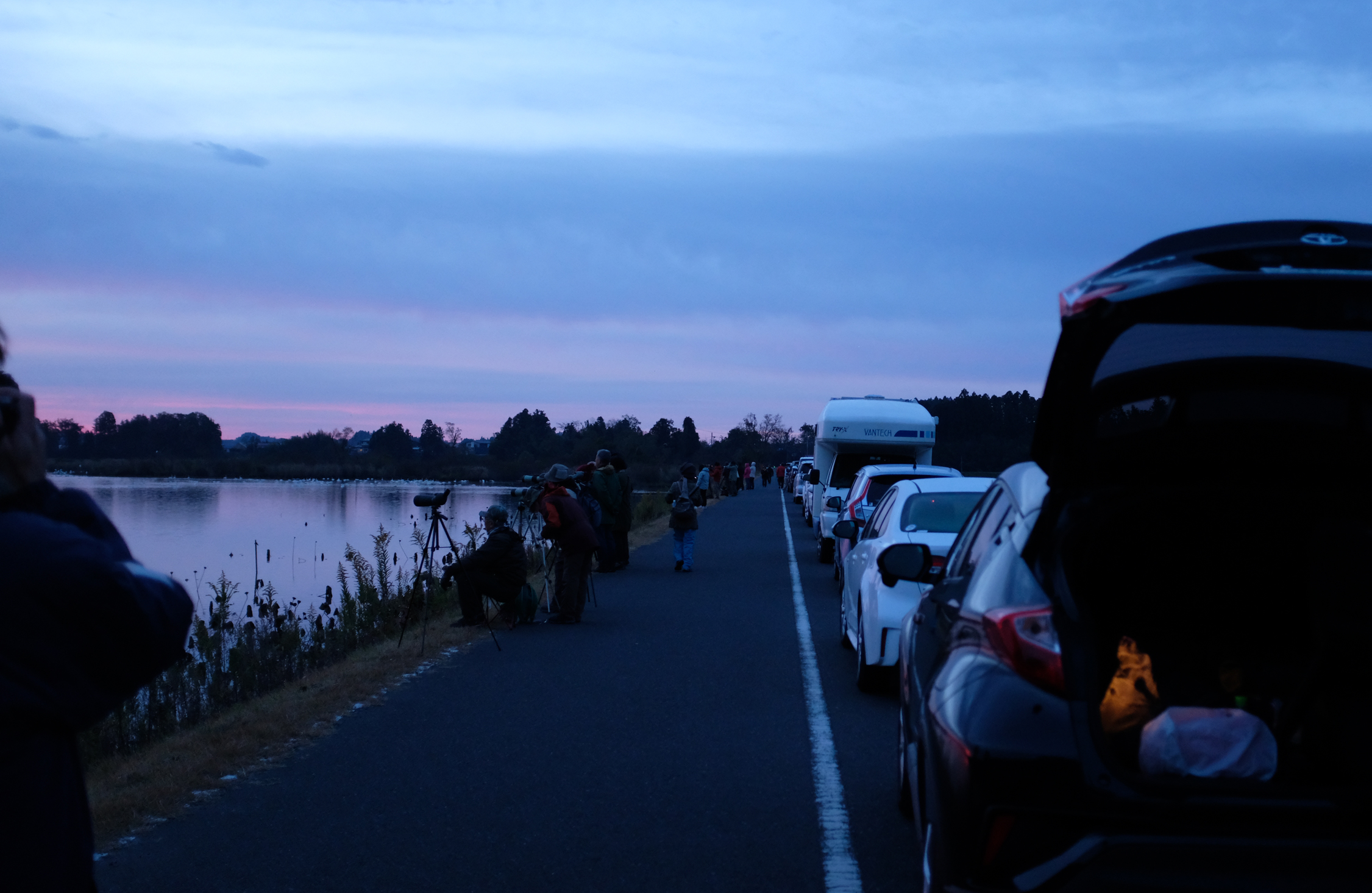 さて、観察スポットに着くと、すでにびっしり縦列駐車された車。県外ナンバーもたくさんで、手には大きな望遠レンズの付いた一眼カメラ、という人が多い。この日、同じツアーに参加していた90歳を超えているというおじいさんも、三脚と立派なカメラを携えて、「朝焼けをバックに飛び立つガンを撮りたい」と燃えていた。