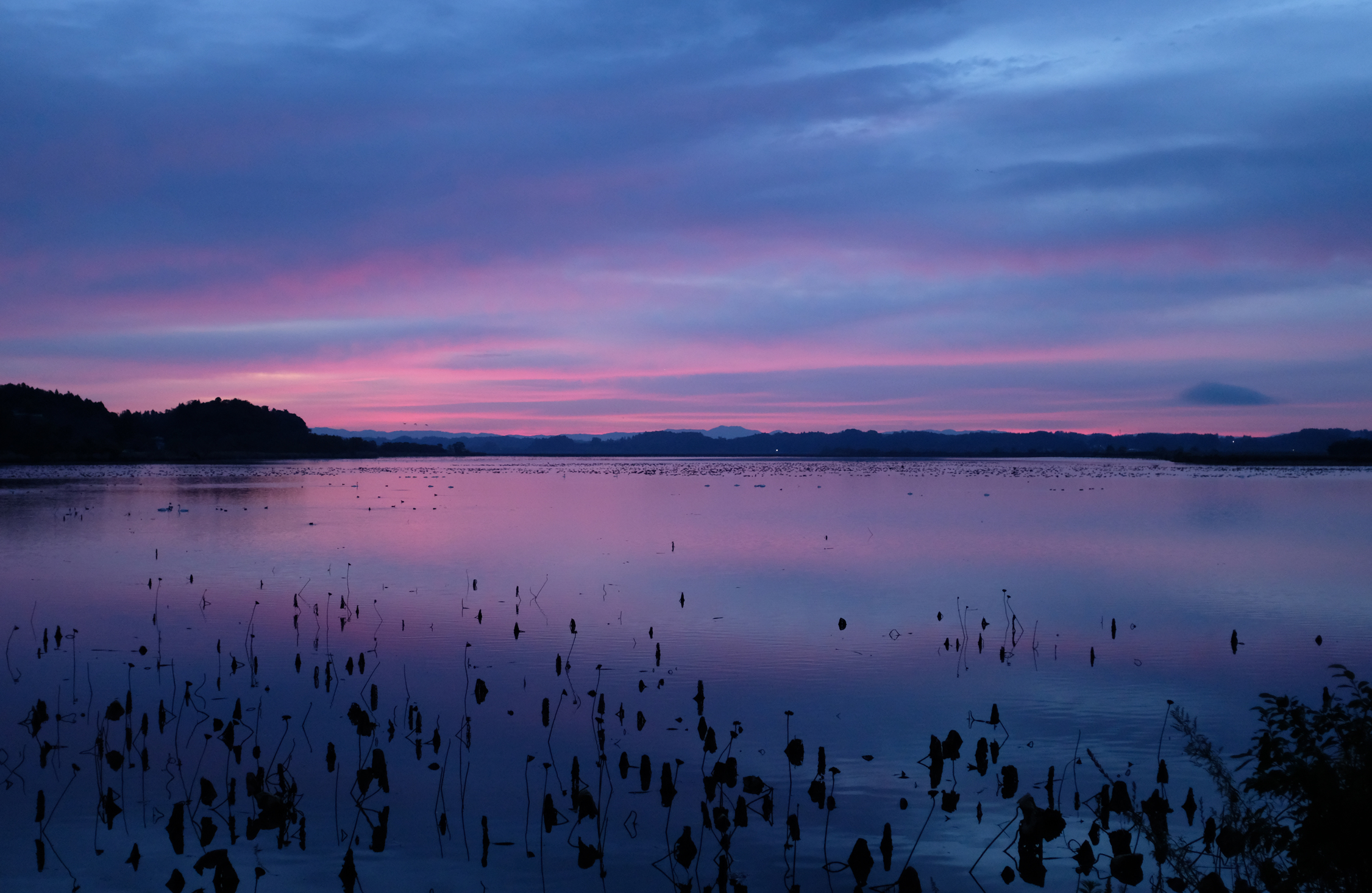 5時40分。少しずつ白んでくる空の下、沼からはギャアギャアという鳴き声が絶えず聞こえてきて、水面ではもぞもぞと動く影。「だんだん朝になってきたから鳴いているんですか?」と聞いてみると、「いやぁ、一晩中鳴いているんですよ」と嶋田さん。また、同じ沼地をねぐらにするカモは夜行性で、 ガンと入れ替わりでねぐらに戻ってくるそうだ。