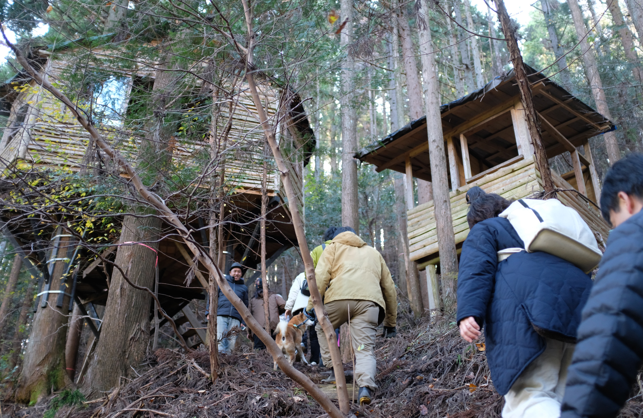 お話をうかがった後には、みんなで裏山へ行き、石毛さんが建てたツリーハウス見学も。木の上から見下ろすのって気持ちがいい。ツアーに参加していた子どもたちも、山を駆け巡って楽しそうだった。