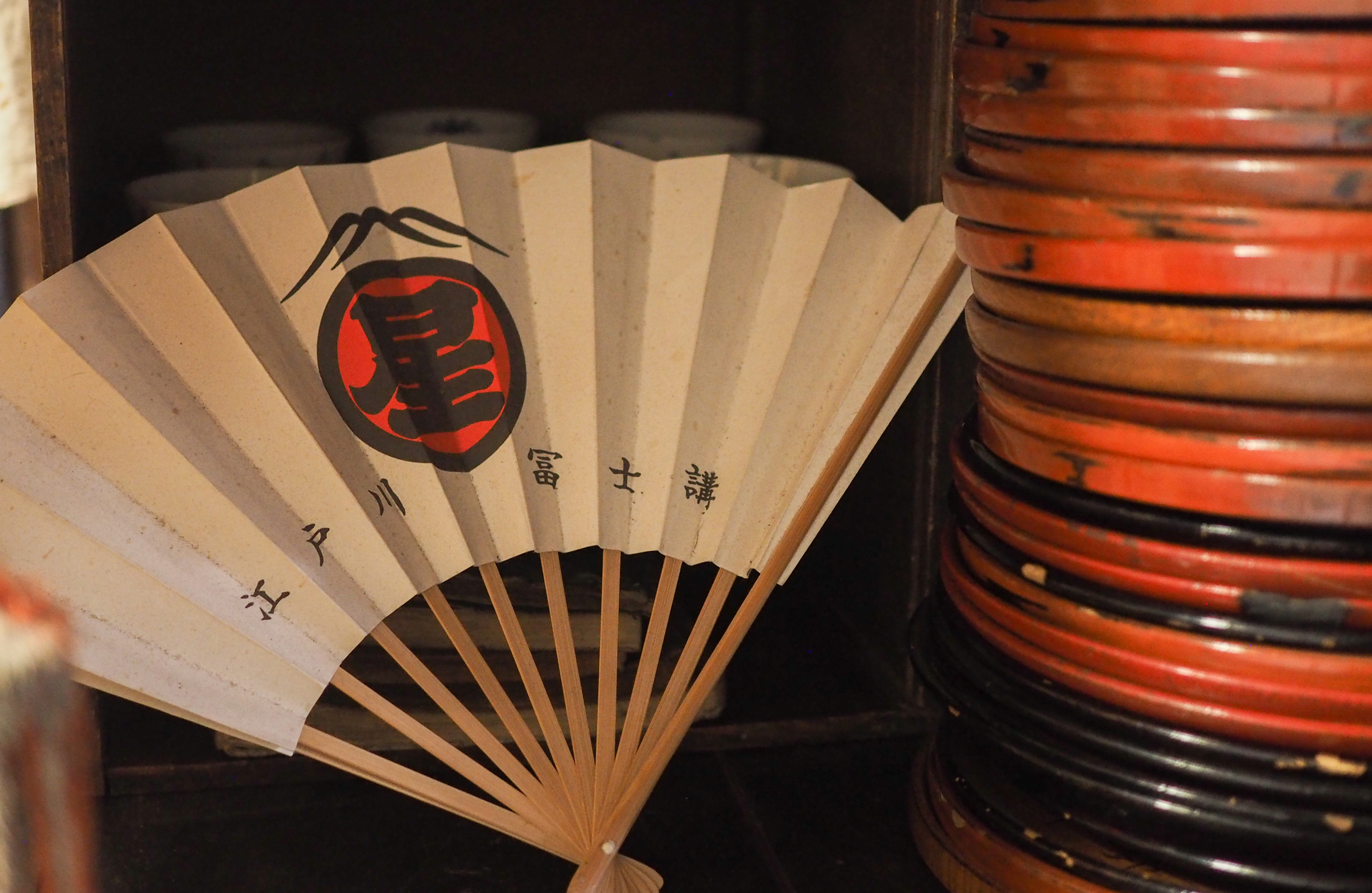 「御師の家には、富士講の人たちからの贈り物や記念品がたくさんあります。それらは『奉納品』と呼ばれ、贈った富士講のマークがついているんです」