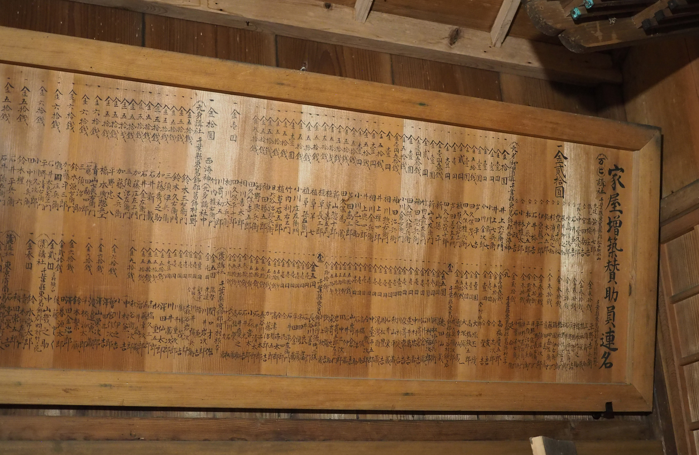 立派な御神前に惹かれて、多くの富士講が菊谷坊を選んだのだろうか。そう聞くと、真一さんが「逆ですね」と言った。御神前の両側に並んだ、富士講の人々の名前が刻まれた板を見せてくれる。