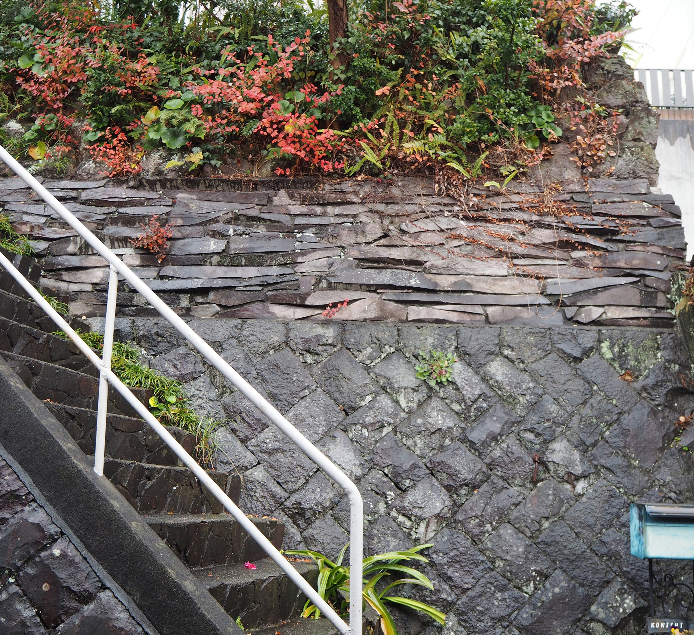 午後3時。今日のまちあるきは、「真鶴出版」の入り口の前にある石垣を眺めることからはじまった。「あそこを見てください」と友美さんに言われ、上の方を見上げると、石垣の一部は、平たい石を積み重ねたような独特の形状をしていた。これは、まさに真鶴らしい石垣なのだそうだ。