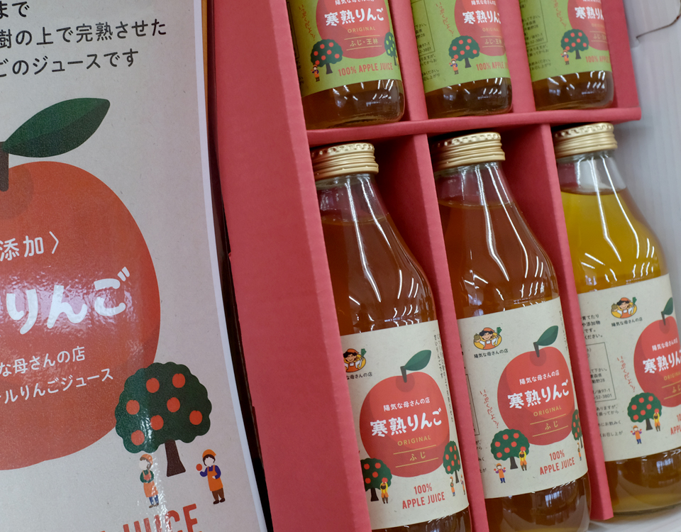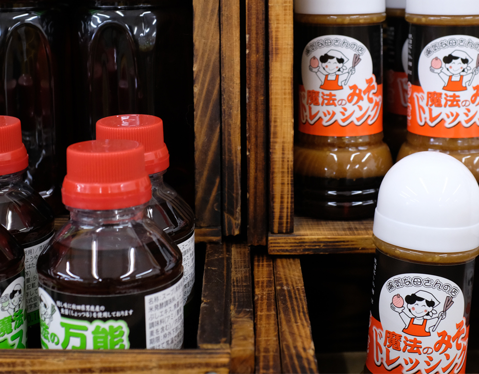 もったいない、無駄にしない精神は充実した加工製品にもあらわれる。お惣菜や漬物のほか、”陽気な母さん印”のりんごジュース、ドレッシングなども。