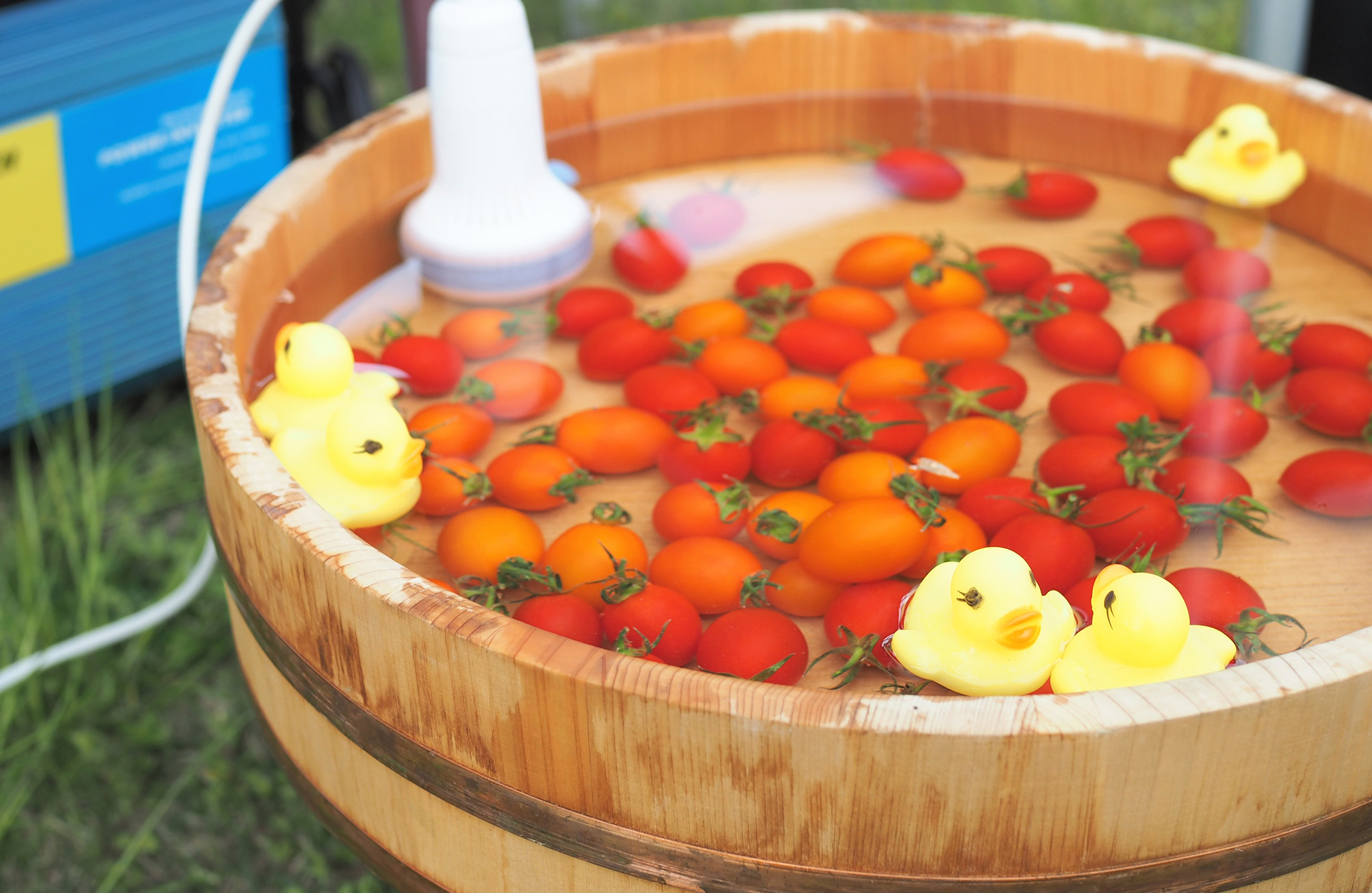 取材の日、飯嶋さんはマルシェに参加していた。「せっかくなので、マルシェの様子を見て、楽しんでほしい」という飯嶋さんのブースの横には、なぜか水を張ったたらい桶。なんだろうと見ていたら、飯嶋さんはそこにミニトマトと数匹のアヒルのおもちゃを流し込んだ。