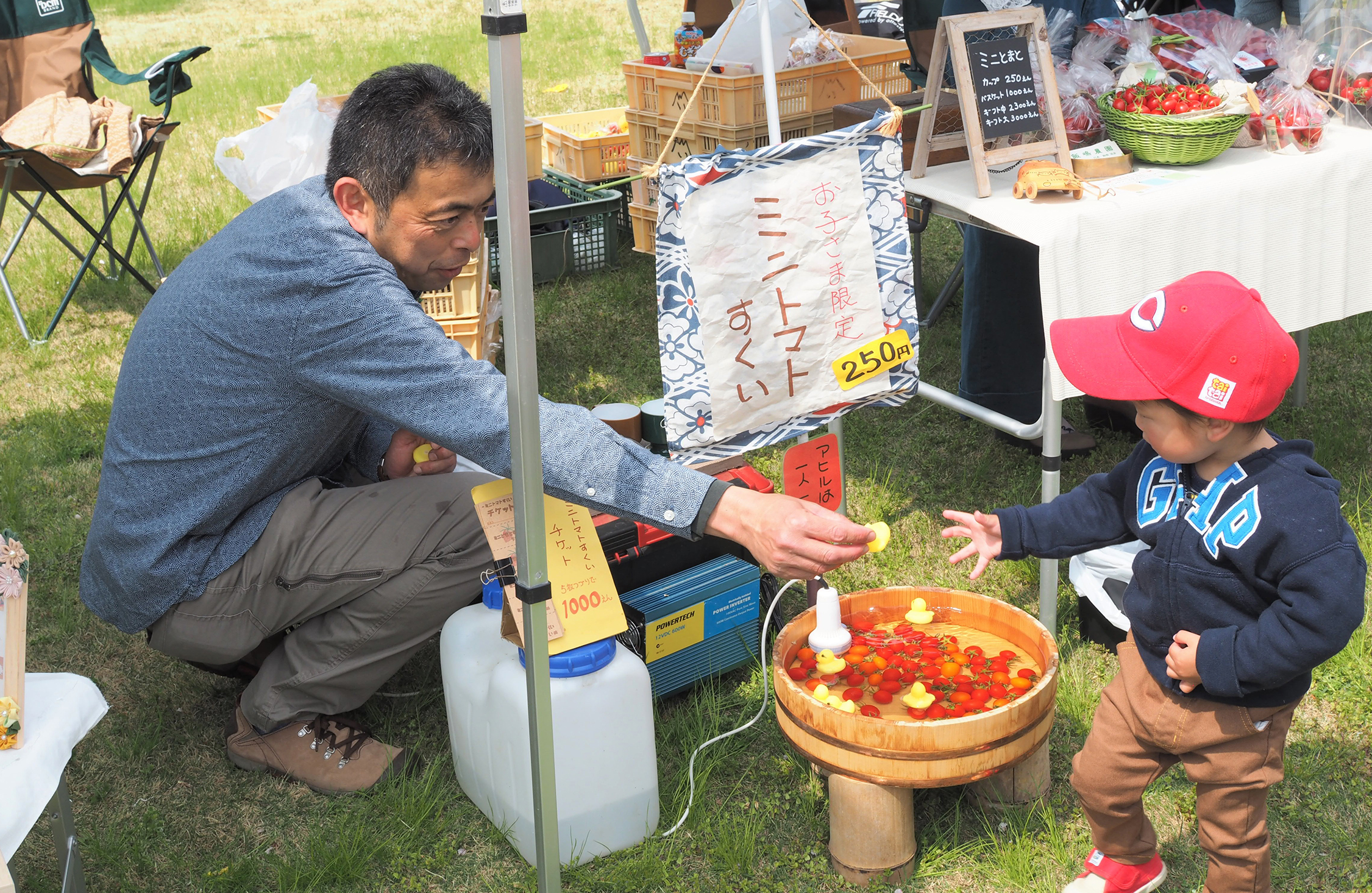 そのまま売ってもミニトマトはどんどん売れていくのに、「子ども限定」のミニトマトすくいを催しているのだ。子どもたちが吸い寄せられるように集まってくるのが嬉しそうで、ギフト同様、この人は自分が楽しくてやっているんだなと思った。毎回、かならず「おまけね」と言ってアヒルを入れてあげる笑顔が印象的だった。