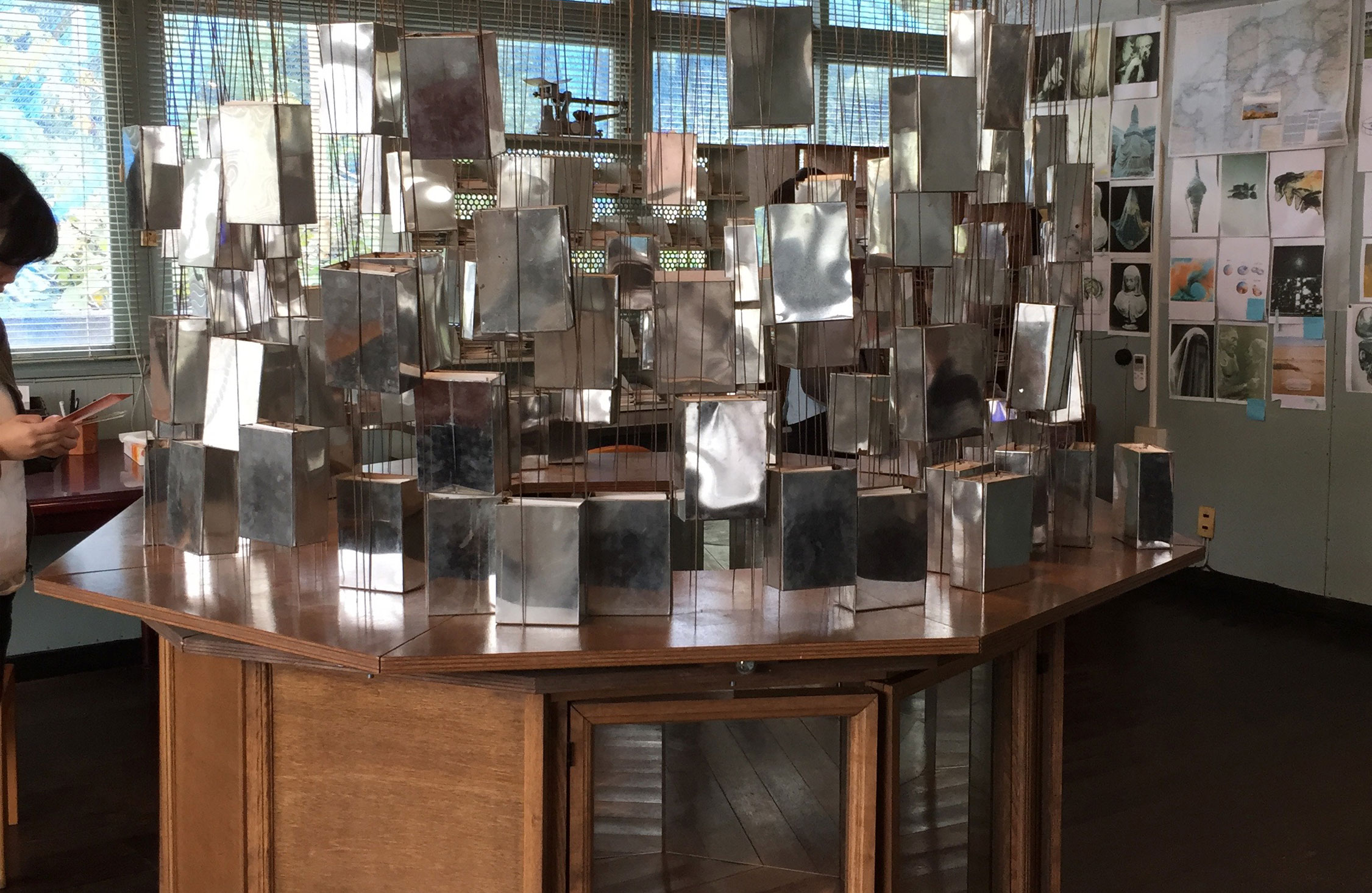 中に入ると、淡い光がクルクルと回る優しげな空間に、たくさんのハガキや手紙がまるで波間に漂流するようにゆらゆらと揺れていた。
