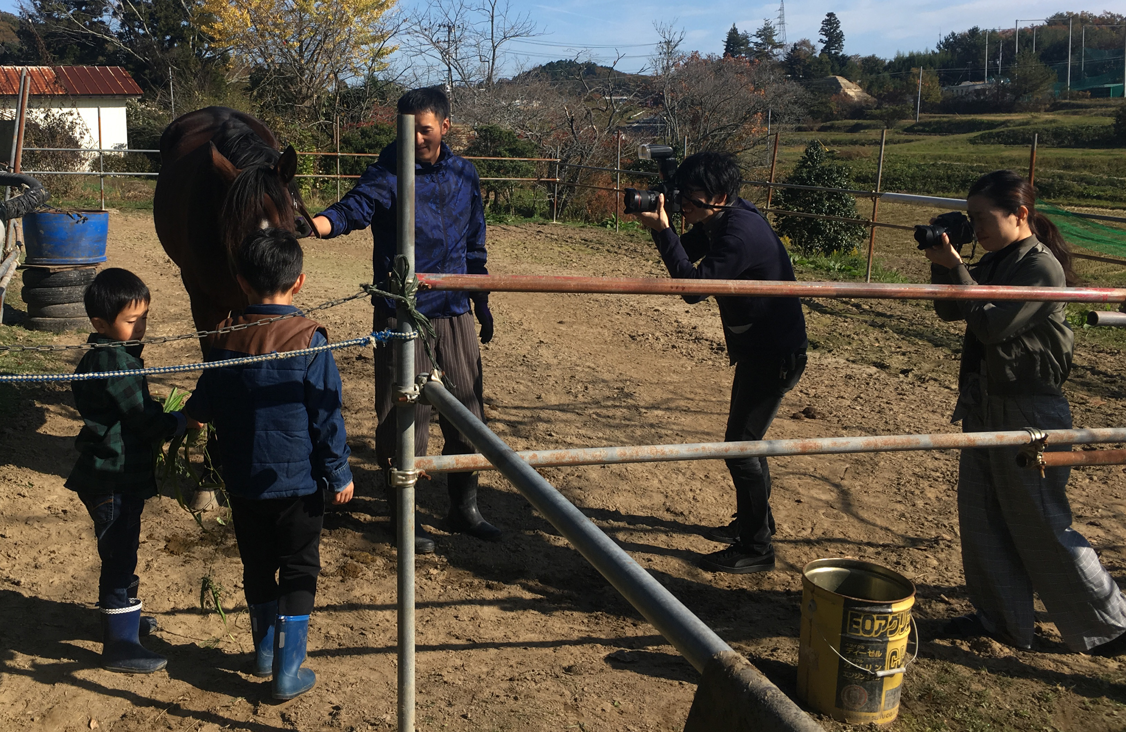 のしのし歩いて行くノーリーズンに、カメラマンの鈴木宇宙さんが必死について行く。さらに市の広報誌の担当カメラマンもそれにくらいつく、という様子で気迫がすごい。途中足を取られながらもだんだん馬との呼吸もあってきて、とても素敵な写真が撮れた。「昔に比べてずいぶん穏やかになったよ」とノーリーズンについて話す馬主の加藤さん。G1(競馬の最高峰のレース)を制したこともある馬の気性は、かつてとても荒かったらしい。いまではぴたっと加藤さんに寄り添いつぶらな瞳をうるうるさせている。