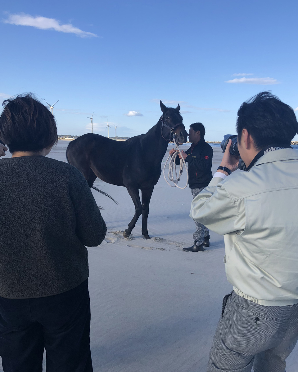 表紙撮影、しかも創刊号ということで気合が入っていて、ロケ地は海岸。実際、野馬追が近づくとこの砂地で練習をするそうだが、馬運車に乗せて馬を運ぶのはなかなか大掛かり。近くで見ると馬は大きくて、その気高い雰囲気に気圧される。