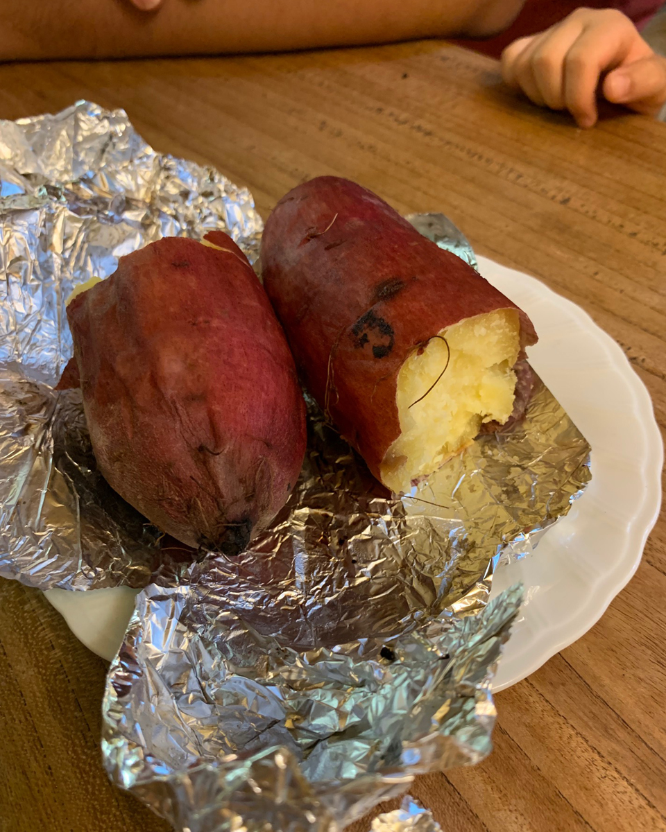 ナナオは、鉱物のホカホカの焼き芋にかぶりつき、私たちも焼きたてのマルゲリータピザを頼んだ。