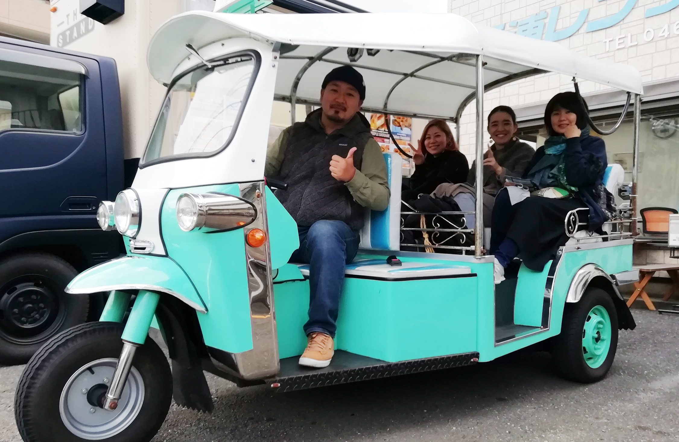 トゥクトゥクをレンタルできるのは、三浦海岸駅前に営業所を構える「三浦観光バス」。ある日、「平日の昼間だけど、誰か、三浦海岸で一緒にトゥクトゥクドライブしない?」とフェイスブックで呼びかけたら、「行く!」と連絡をくれた自由な3人、ヒラガさん、ゴトウさん、アオキさんと駅で合流して、午前10時、営業所に向かった。