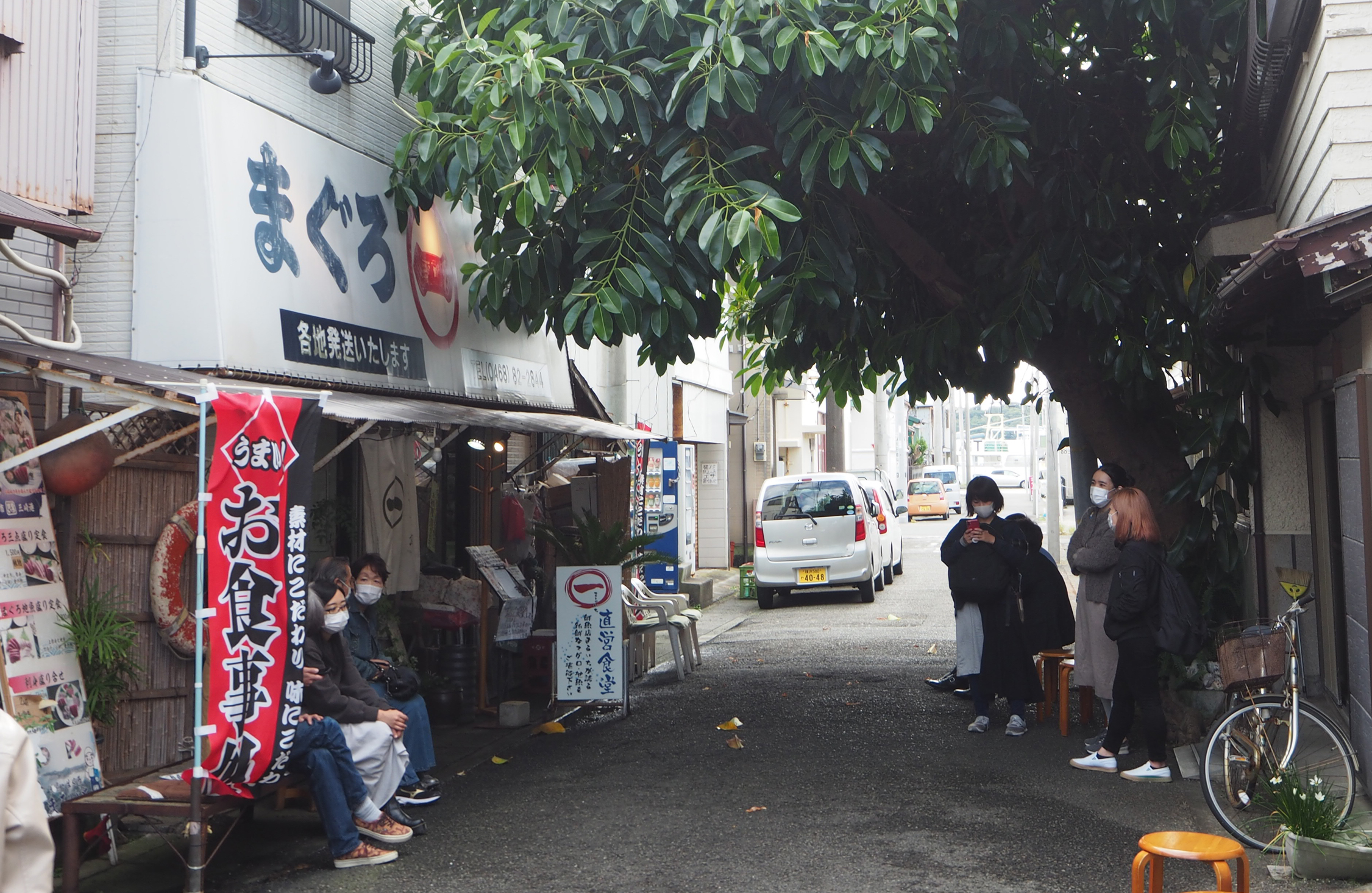 そんなこんなで待つこと1時間、ようやく店に入った僕たちが迷うことなく注文したのはマグロの三点盛り。三崎魚港はまぐろの水揚げで全国有数の港で、「マグロの町」と呼ばれているのだ。張り紙メニューの「タコブツ」(タコのぶつ切り)と、それぞれご飯とみそ汁だけの「ご飯セット」も頼んだ。