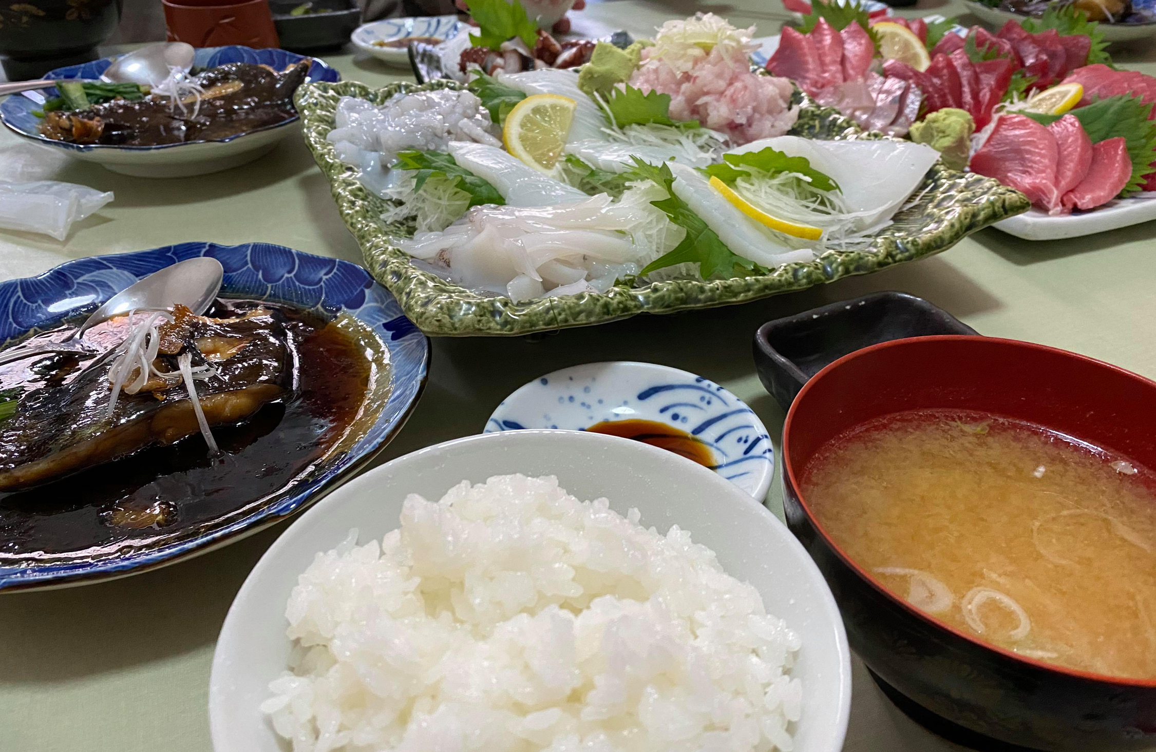 僕らは、地元で「ダツ」と言われる深い紺色をした細長い魚と立派なアオリイカを選び、食堂で出してもらうことにした。合計5500円。ダツは刺身と煮込み、イカはお刺身に。もちろん、お店のお姉さんのおススメ通りだ。