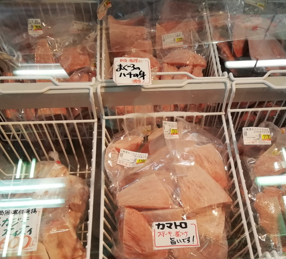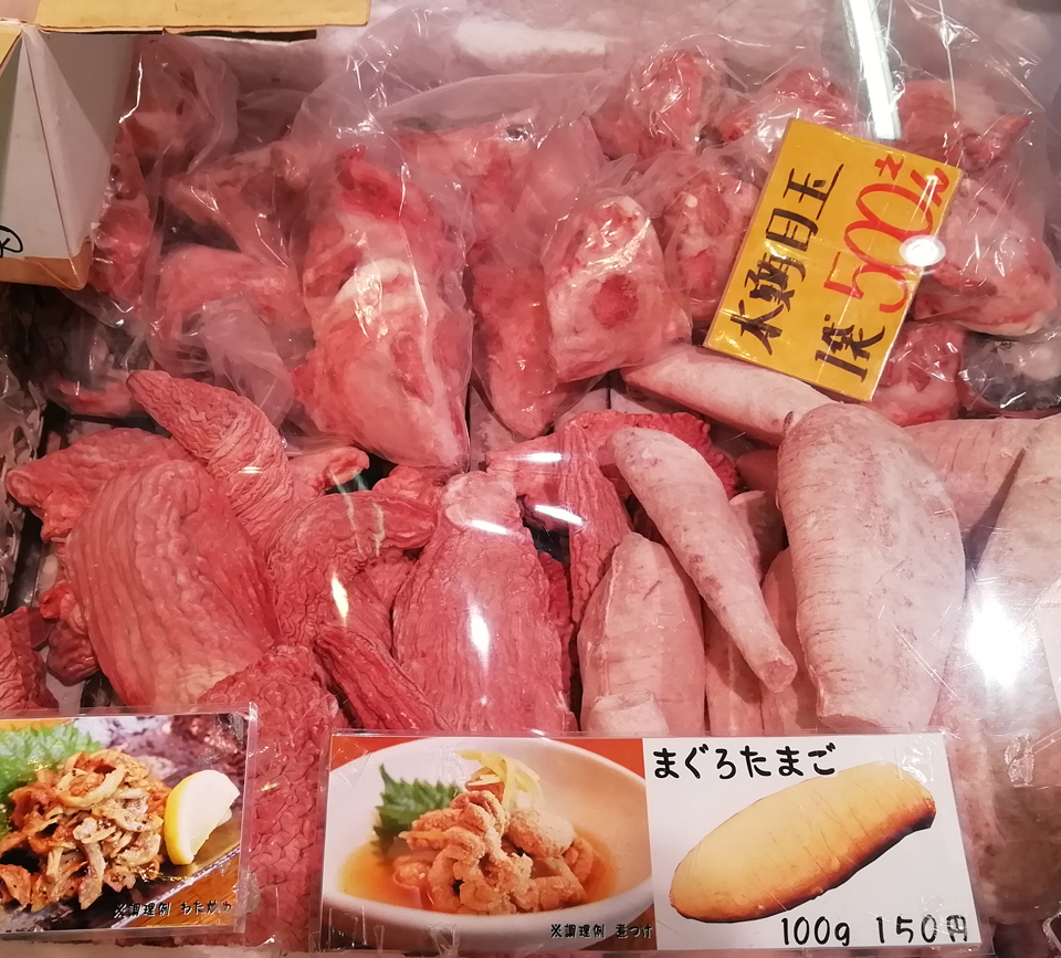 お腹が満たされ、心に余裕ができてから改めて海鮮市場を眺めると、まぐろに関するさまざまな商品が売られていて興味深い。「まぐろの胃袋」とか「まぐろの卵」とか、初めて見るものばかりだ。