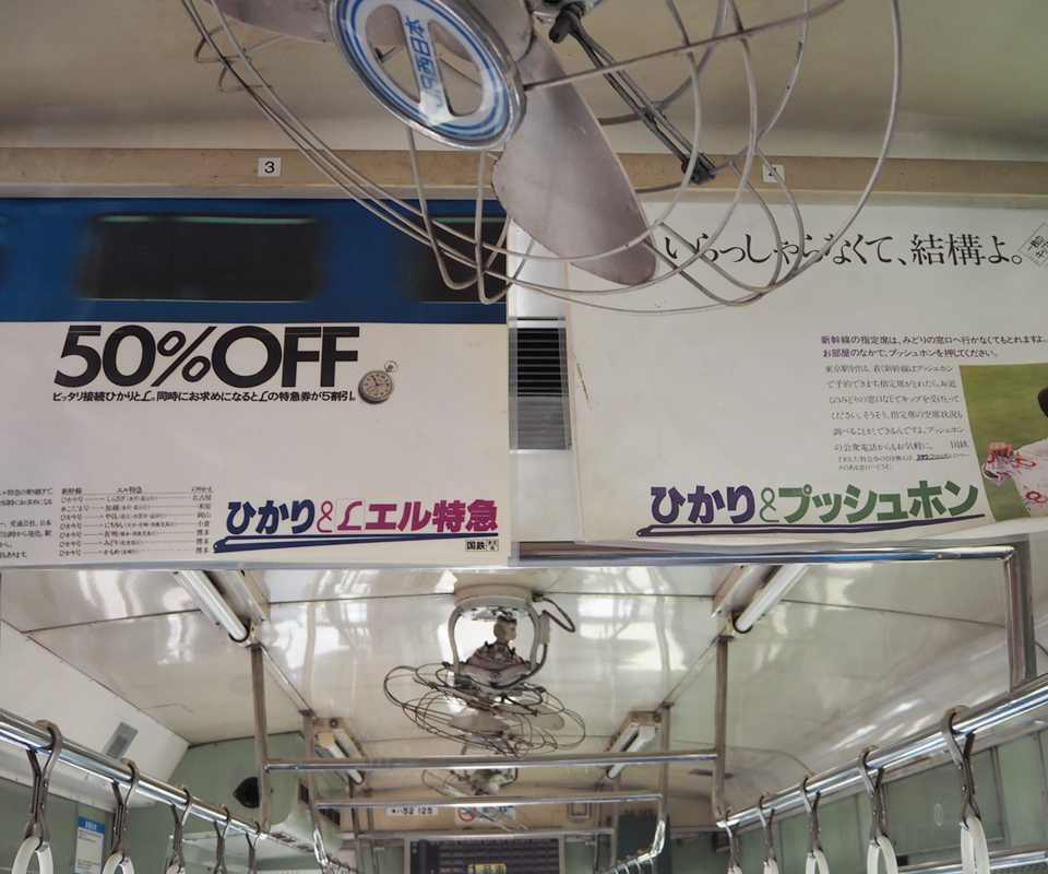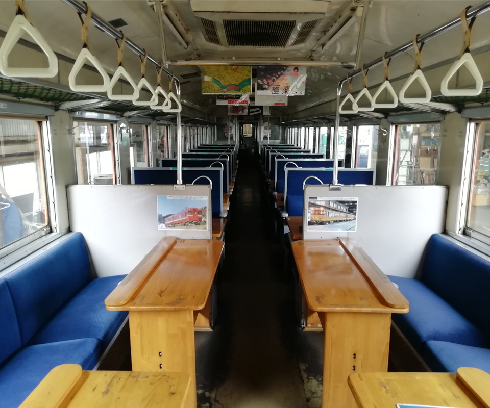 取材の日は平日だったので、検修庫にあった「キハ28」と「キハ52」を案内してもらった。青いボックスシートが並び、天井に扇風機が備え付けの車内は昭和レトロ感満載。何気なく提示されている車内広告も、昭和期に使われていたものをプリントしているというこだわりだ。毎週土日のみ運行されているレストラン列車で使用されている「キハ28」には、テーブルもある。齋藤さんのお勧めは、「キハ28」でのワーケーションだ。