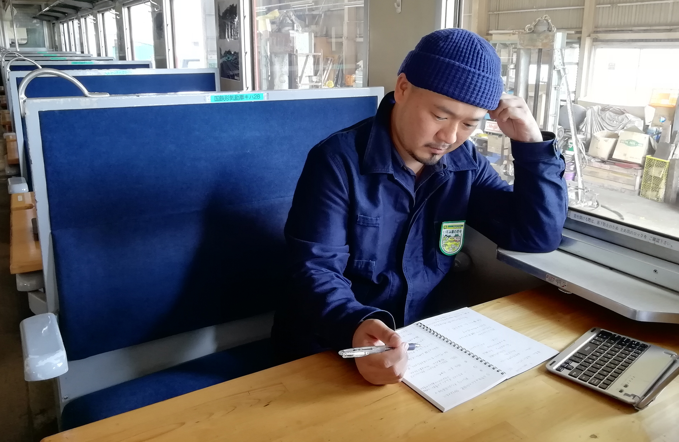 連結している「キハ52」の車両はテーブルがないので、とっておきのグッズを使用してみた。首にかけることができる、折り畳み式のクリップボード。この取材に合わせて購入したもので、これにパソコンを載せればキーボードを打つこともできそうだった。ちなみに、写真のパソコンは齋藤さんのものを拝借した。齋藤さんのアイデアは、まだまだ拡がっている。