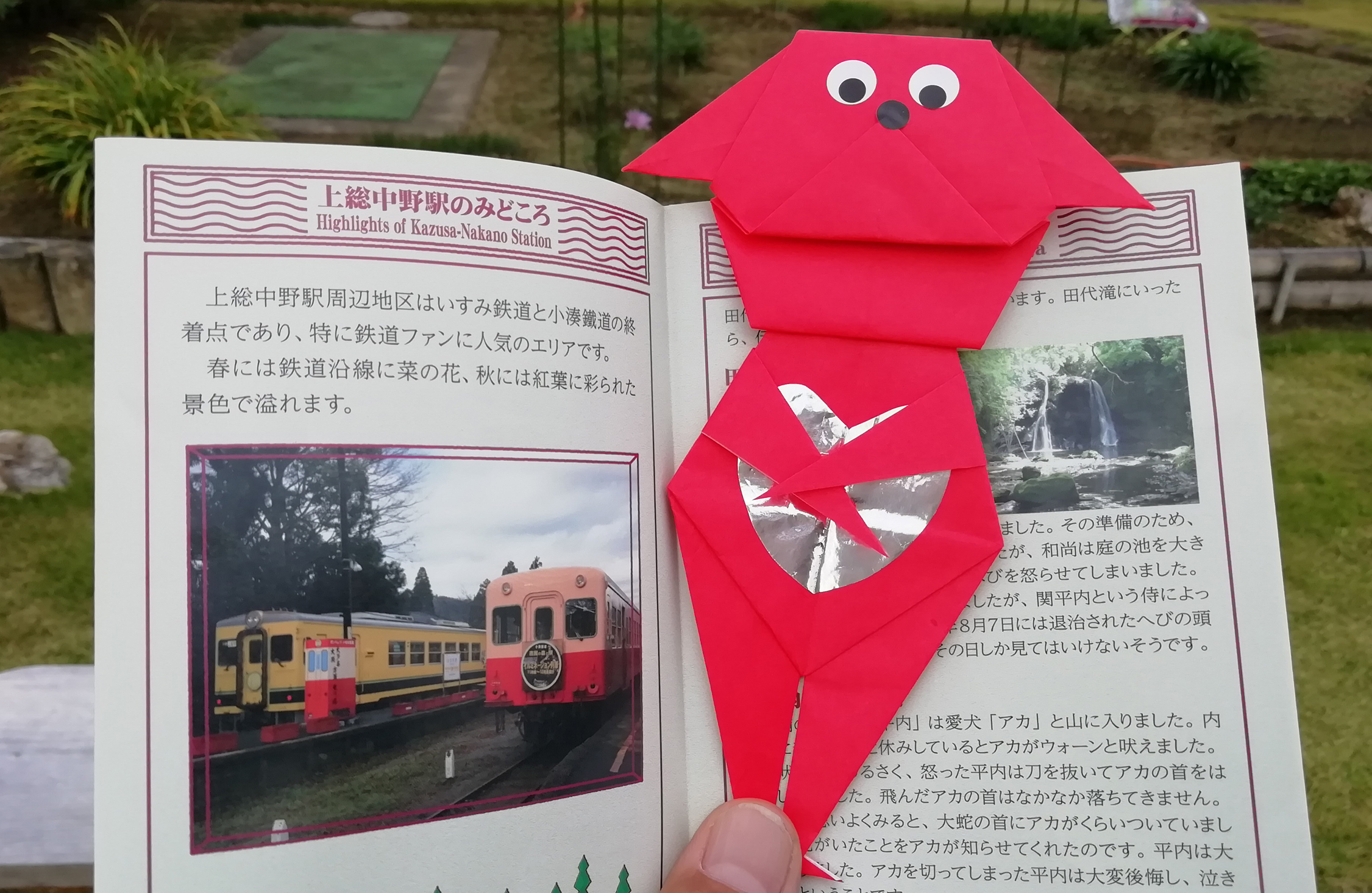さらにそこから2、3分の光善寺に向かっていると、畑仕事をしていたマダムが「こんにちは! どこに行くんですか?」と声をかけてくれた。光善寺です、と答えると、ちょっと待ってて、と言ってご自宅に戻り、すぐに出てきて、「これをどうぞ」。手渡されたのは、上総中野駅周辺の観光案内と、赤い折り紙で折られた千葉県のマスコットキャラクター、チーバくんだった。オカジマさんが、「チーバくんですね! これご自分で?」と尋ねると、マダムは「はい」と素敵な笑顔を浮かべて頷いた。こういう小さな、でも予想外の出会いこそ、旅のだいご味だ。