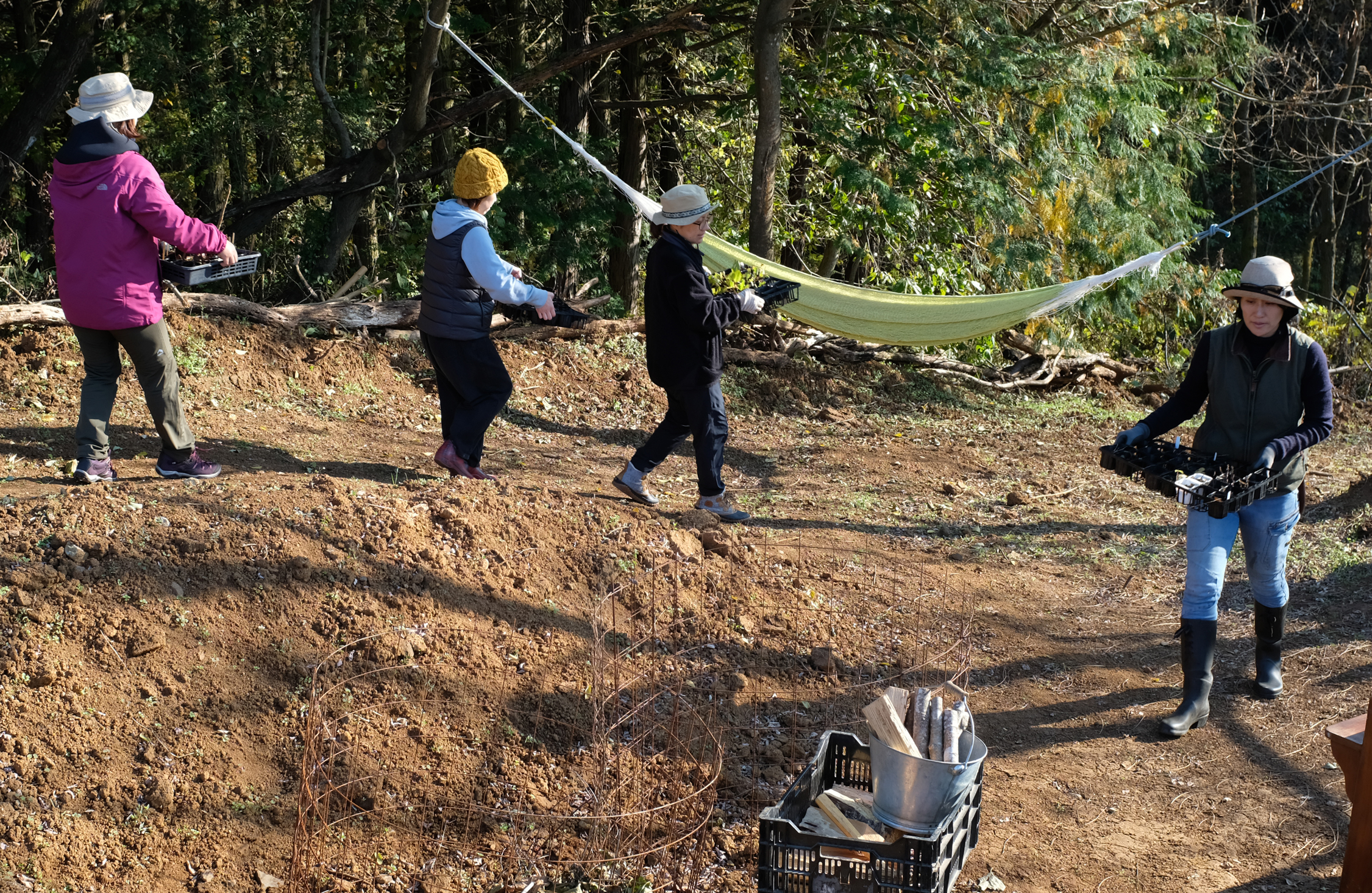 午後には、微力だけど冬支度のお手伝いもできた。この日のcamino natural Labo.は11月とは思えない暖かさで穏やかだったが、冬の風の威力は凄まじいという。そこで森の木々の苗を、風が直接吹きつけない場所へ移動し、そこを石で囲う。両手で持ってよいしょ、よいしょと6人で運んだ石が、まだまだ頼りない苗木を守るんだ。そう思うと、ほんの些細なお手伝いでも誇らしい気持ちがしてくる。