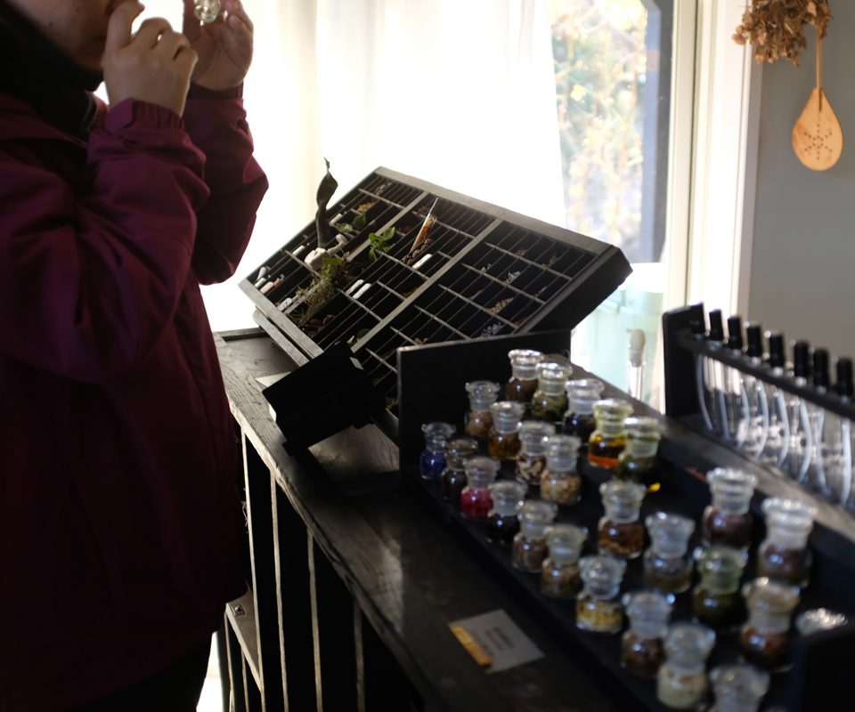 最後に、参加者皆が小瓶の中で抽出された植物のエッセンスを選んで自然の香水を作ることに。私もインタビュー時に再訪して手に入れた。瓶を明けてふわっと香る香りや見た目から2種類の植物を選んだら、寿香さんが2つの植物の意味を教えてくれる。それはあたかも占いを聞いているように胸が高鳴る。