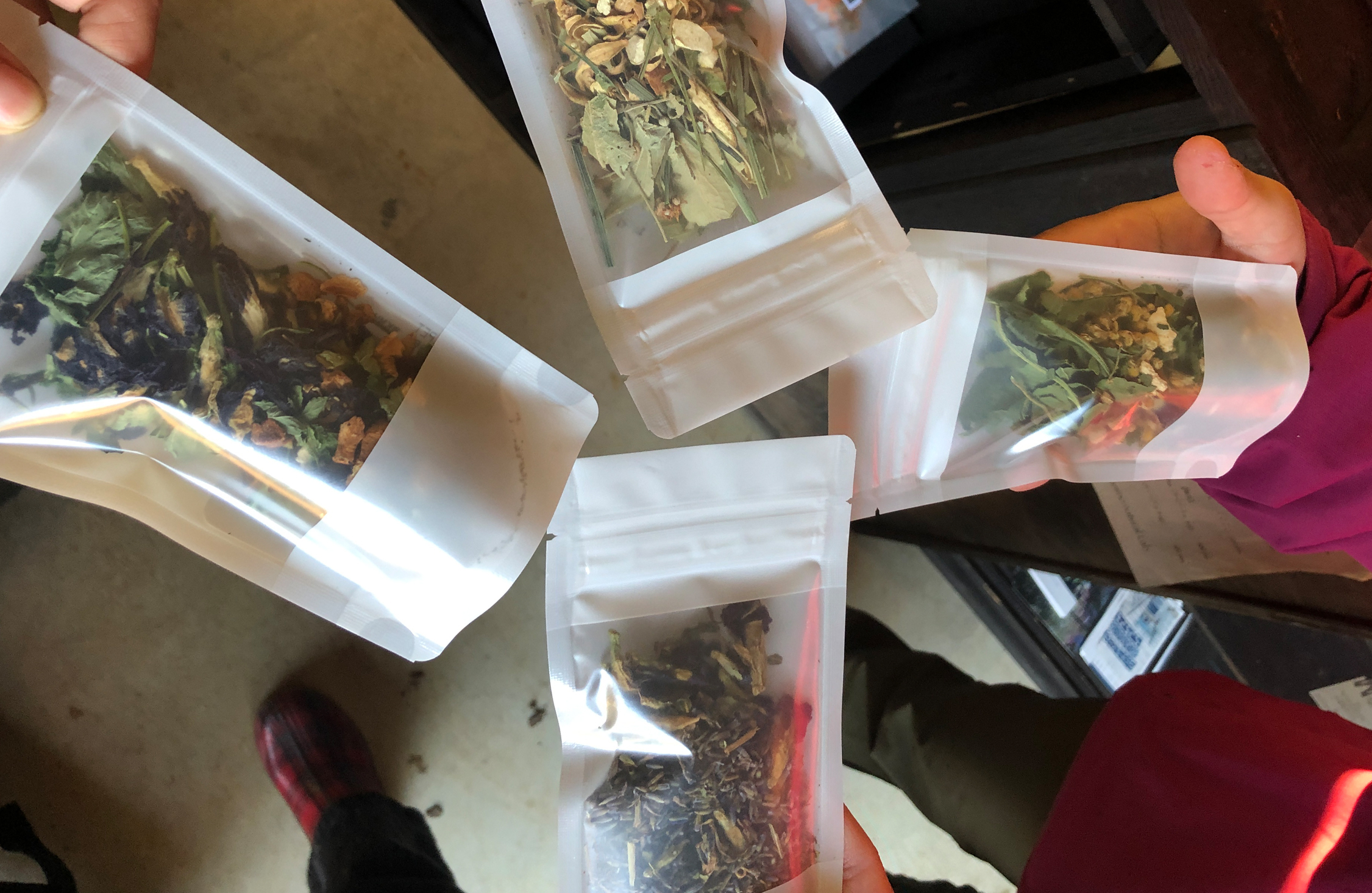 さて、野外で1日を過ごした後、体に変化はあるのか? 朝と同じようにブレンドティーをテイスティングしていくと、明らかに朝より体に染み渡る。答え合わせをすると、そのお茶は「Blue」。レモンバームをベースにしたお茶は、淹れると鮮やかな青色。目が疲れている人におすすめらしく、パソコンばかり見ている私にぴったりだ。