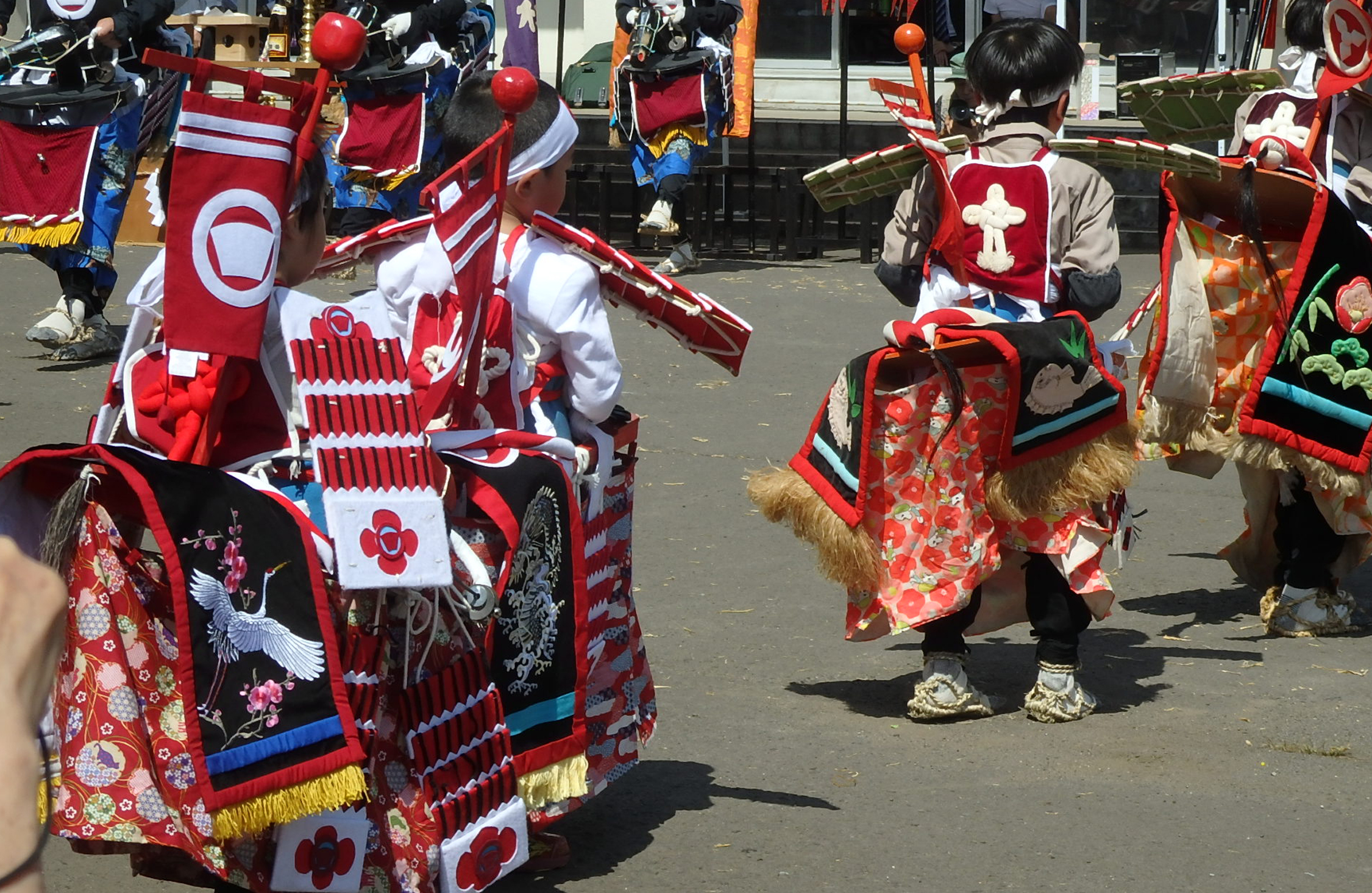 子どもの装束は手作りだそうで、お母さんやおばあちゃんが苦労して夜なべしてちくちくしたであろう刺繍が見事だった。
