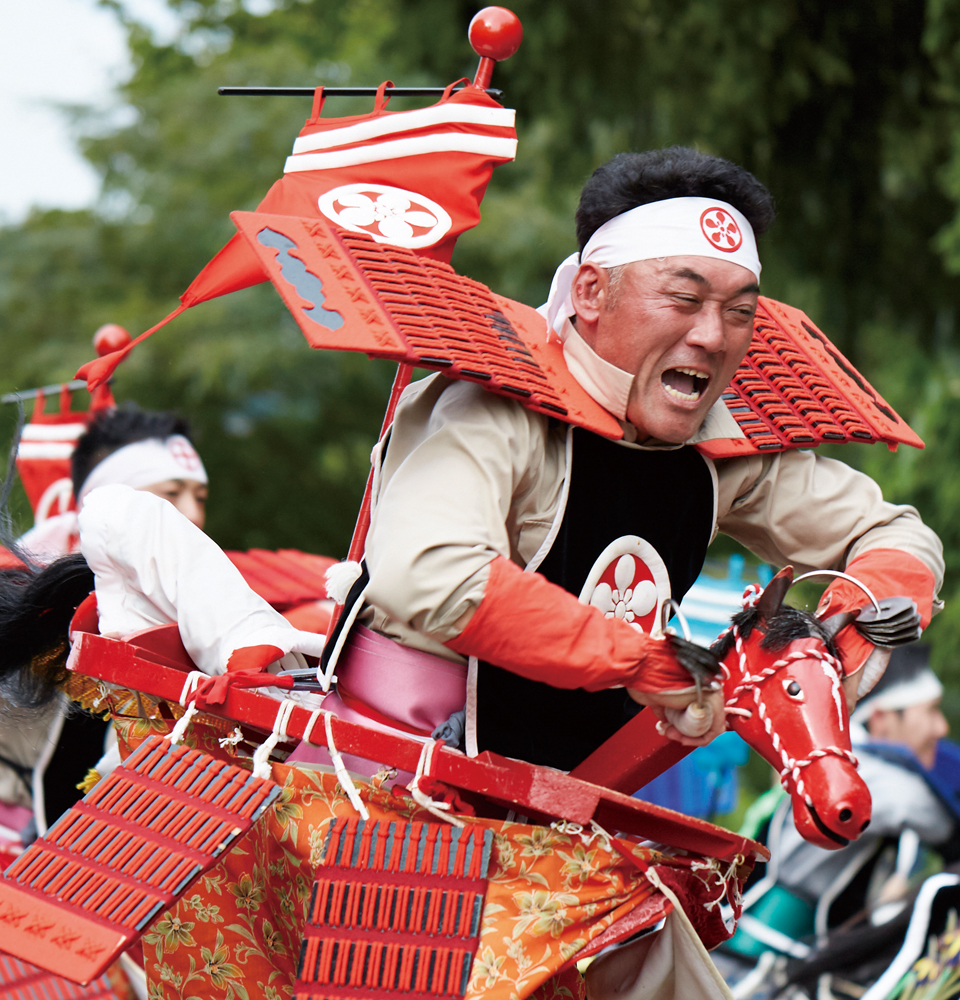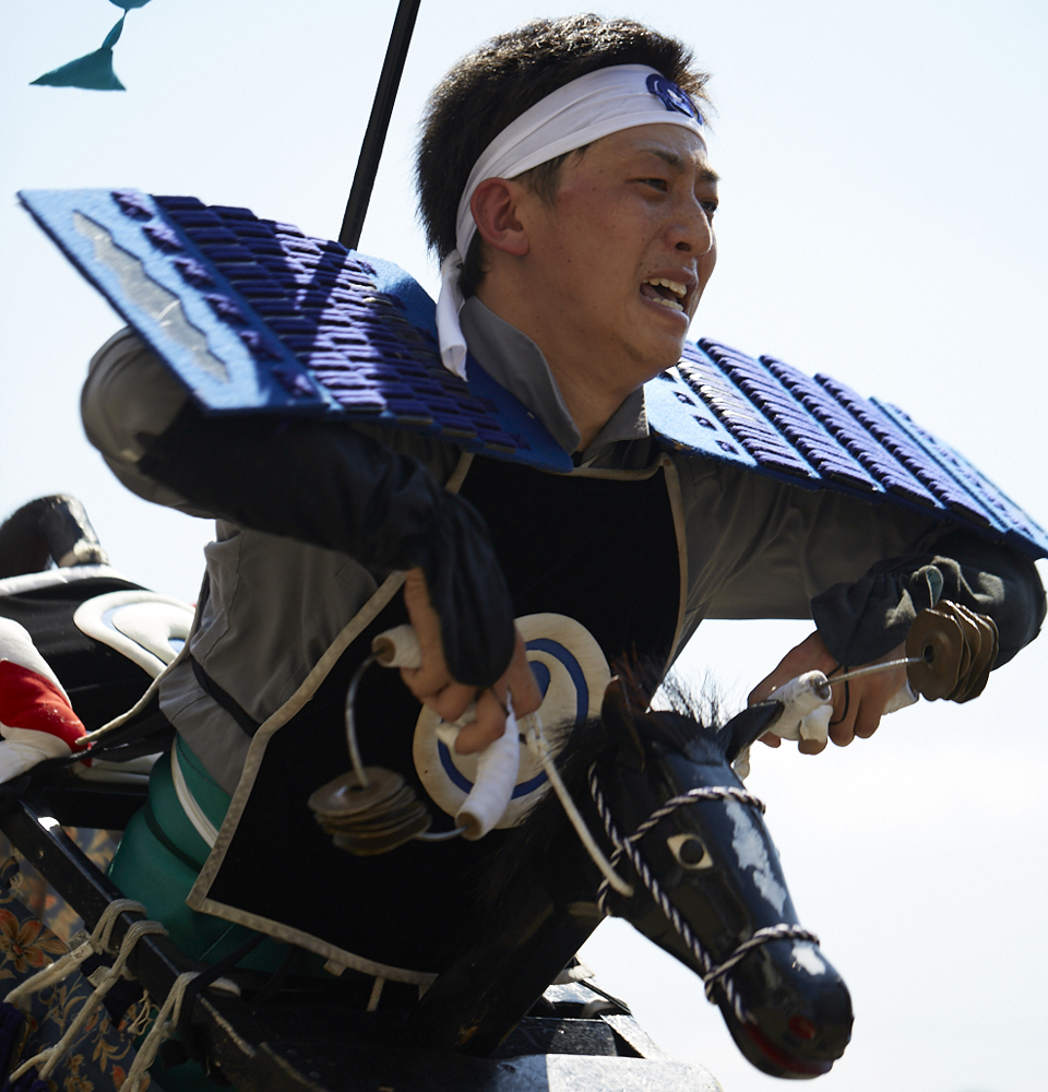 子どもを横で見守り続ける家族に混ざって、あらためて騎馬隊を眺めると、やはりその装束の美しさに目を奪われる。それに騎馬武者と馬が一体になっている造形は、なかなかにユーモラス。だけど、身につける人の動きが加わるとこんなに迫力のあるものになるのだ。