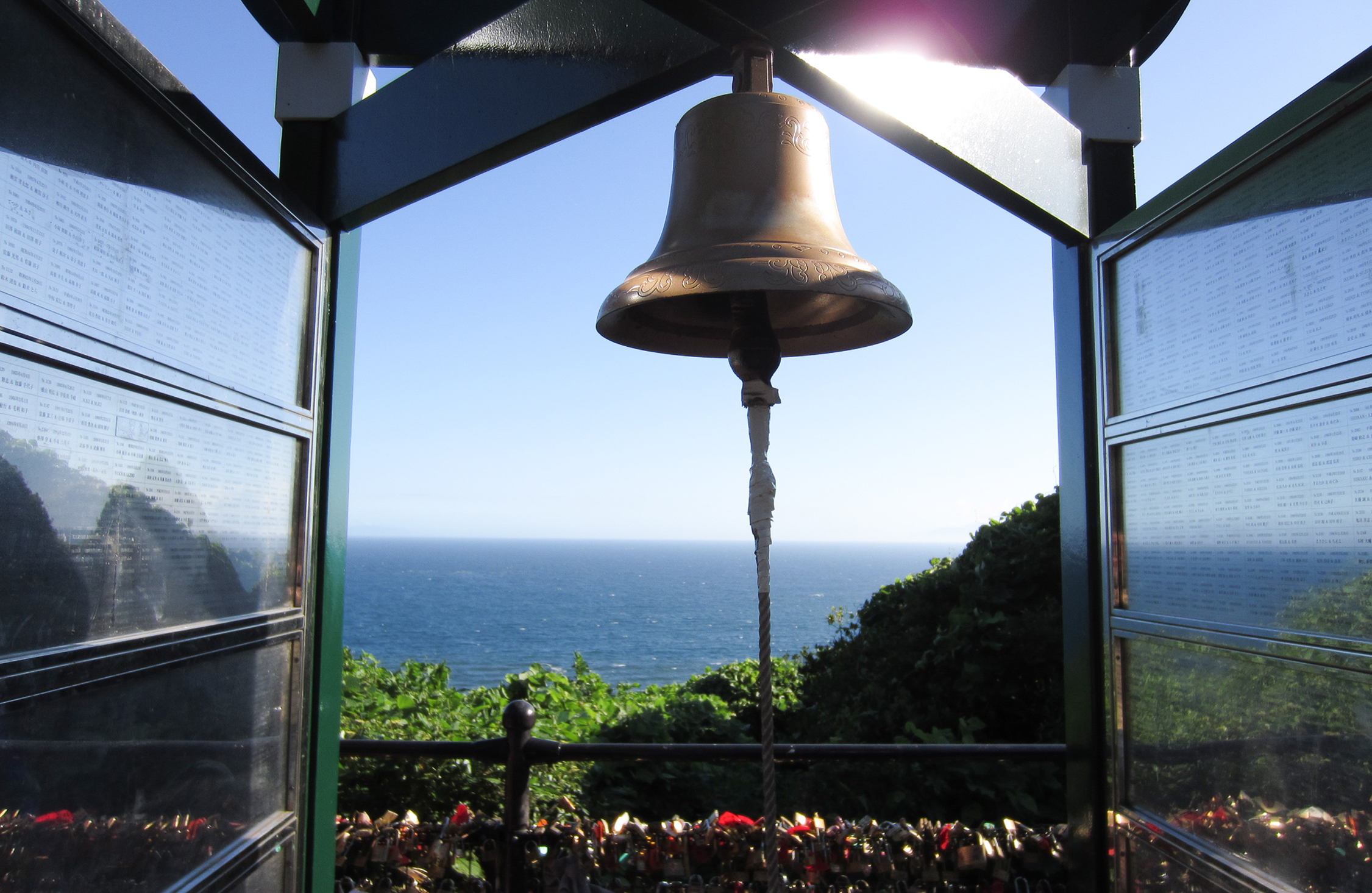 この伝説にちなんで、江の島の高台には「恋人の丘」が設置されている。相模湾を見渡す丘にある鐘を鳴らした二人は決して別れないんだとか。現実的な私たちも、やっぱりこういうものが目の前にあると弱いわけで、しっかりと鐘を鳴らして帰ってきた。