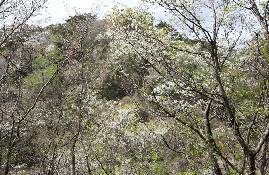 さて、いったん急な斜面を下って、次なる頂、羽黒山に向かって歩き出す。アップダウンが続く、ハイキングコースだ。しかし山のなかにはオオシマザクラだけでなく、さまざまな春の花が咲き乱れていて、それを見て歩くのはとても楽しい。
