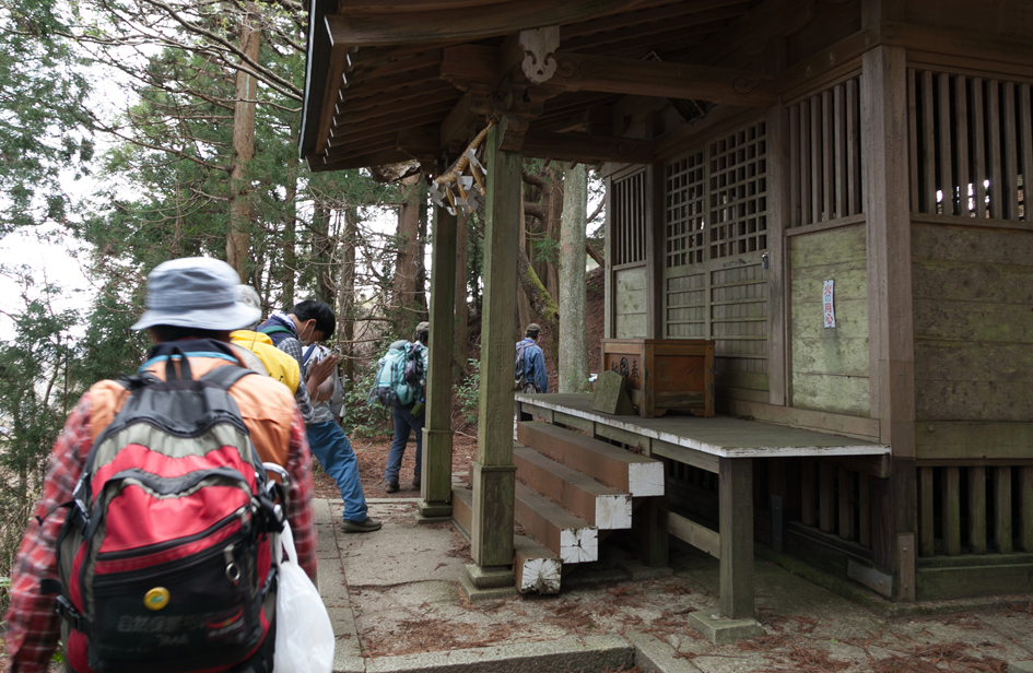 木々の間からちらりと大煙突が見える瞬間があった。さっきはかなり大きく見えたのに、今はだいぶ遠くにある。結構歩いてきたんだな……と思った。そして最後のきつい坂を上がると、ようやっと神峰山神社が見えたのであった。朝、参拝してきたあの神社の本物! である。