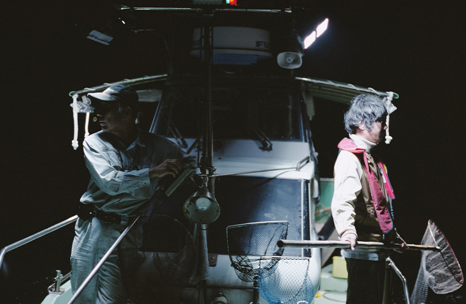 小さな船で夜の日本海へと、静かに滑り出す。といっても湾内から遠く離れるようなことはなかったように思う。船を出してくれたおじさんは本職の漁師というより、半分趣味のような感じで、こうして時々、近場で夜釣りに出るらしい。