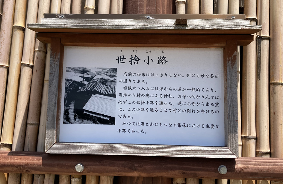 名前の由来ははっきりしない。なんとも妙な名前の通りである。宿根木に入るのは海からの道が一般的であり、海岸から村の奥にある神社、お寺へ向かう人々は必ずこの世捨小路を通った。逆にお寺から出た霊は、この小路を通ることで村との別れを告げるのである