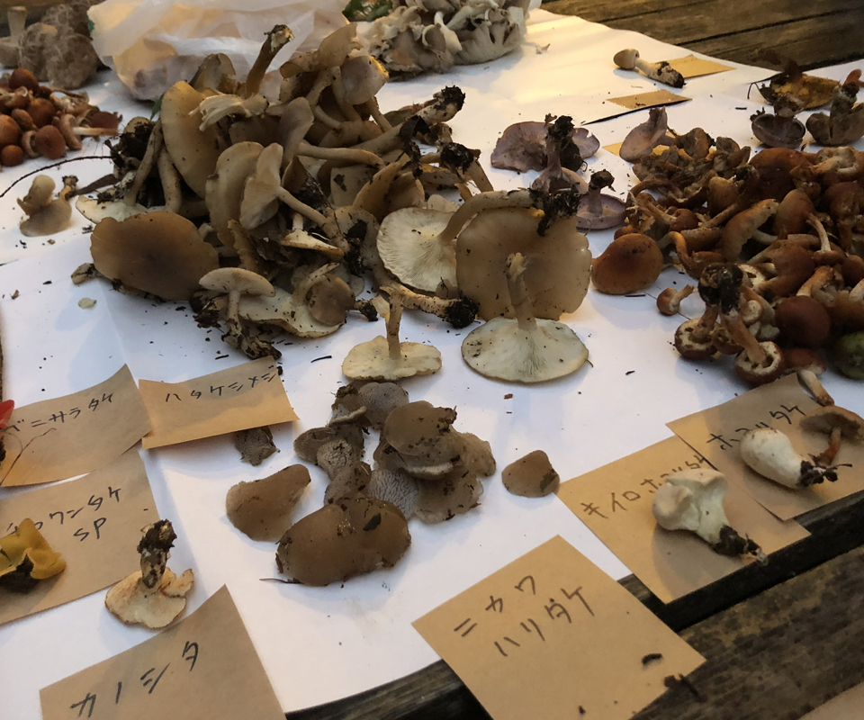 ロッジに戻ると、バルコニーには広く紙が敷かれた。その上に、みんなの収穫がそっと並べられる。きのこ愛好家の皆さん恐るべし!の質と量だ。同じ種類のものは集められる。山のように採れたきのこもあれば、1本だけ横たわるきのこも。それらを、きのこ名人ハチさんが片っ端から判別していく。付箋に名称が書かれ、ペタペタと貼られ、食べられるか否かも知らされる(この作業、自然科学一般で「同定」というのだそうだ)。「お、ハタケシメジがたくさん採れたね。これはおいしいよ」とかいう言葉が聞こえてくると、期待に胸は高鳴る。全ての同定が済んだ頃、日も暮れた。