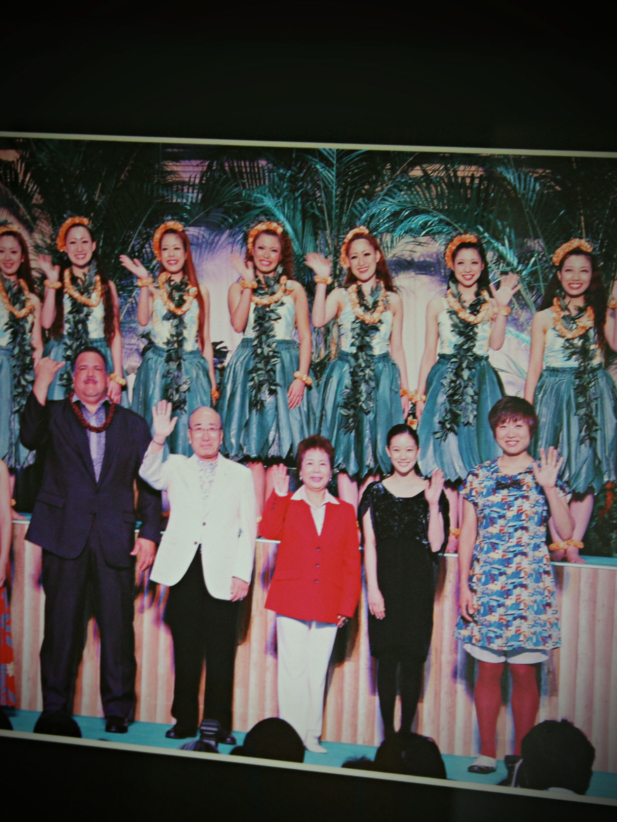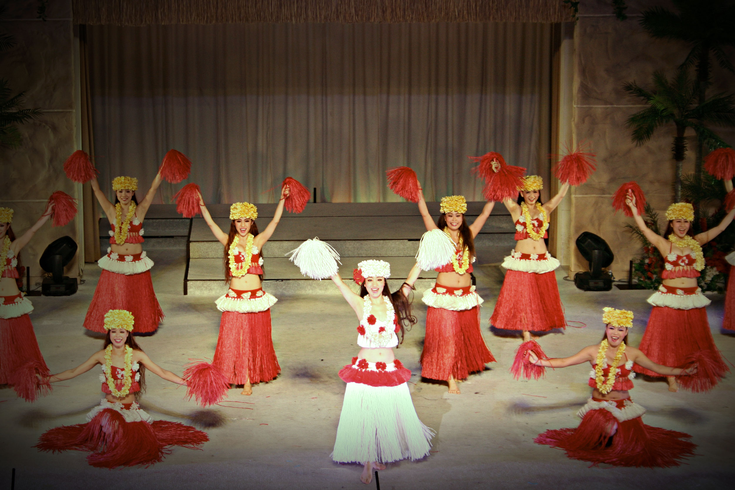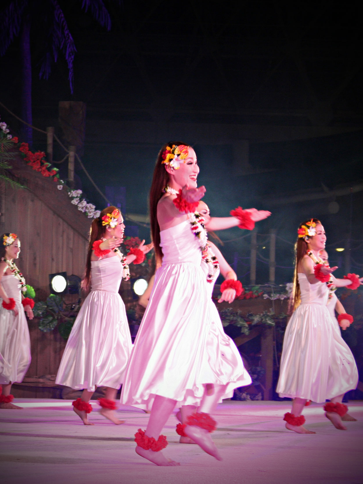 20時30分、眩いばかりの照明がステージを照らすと同時に、赤や黄色の花のレイを頭につけた白いドレスの女性たちが登場した。