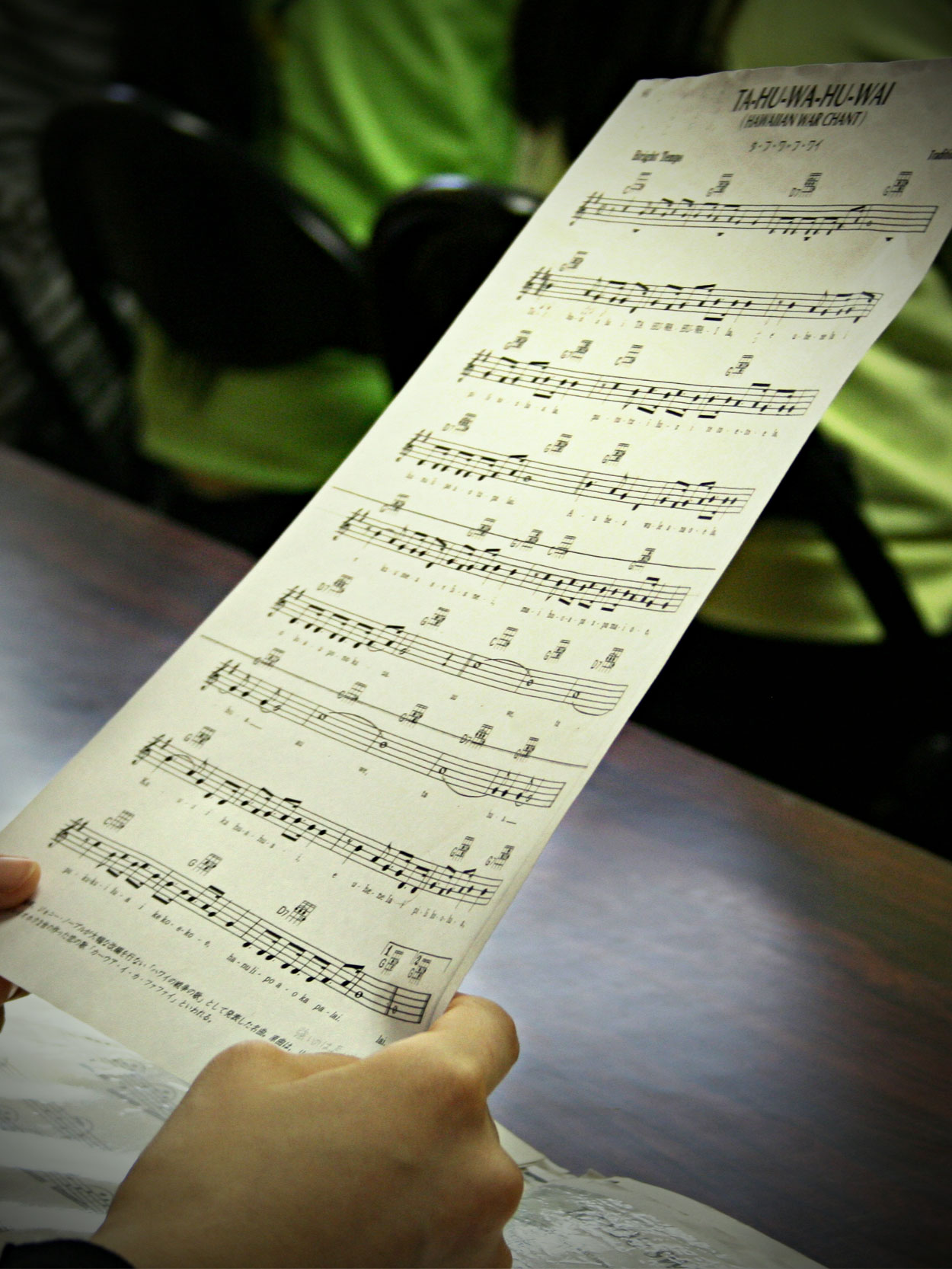 10分間の発声練習の後は、次々と歌を歌っていった。ほとんどがハワイアンの曲で、初耳だった。「To You Sweet Heart Aloha」という曲は「愛しい人よ、さようなら」という内容で、先生が「気持ちを込めて」というとみんなが情感を込めて歌い始め、爽やかな曲なのに少し切ない気分になる。