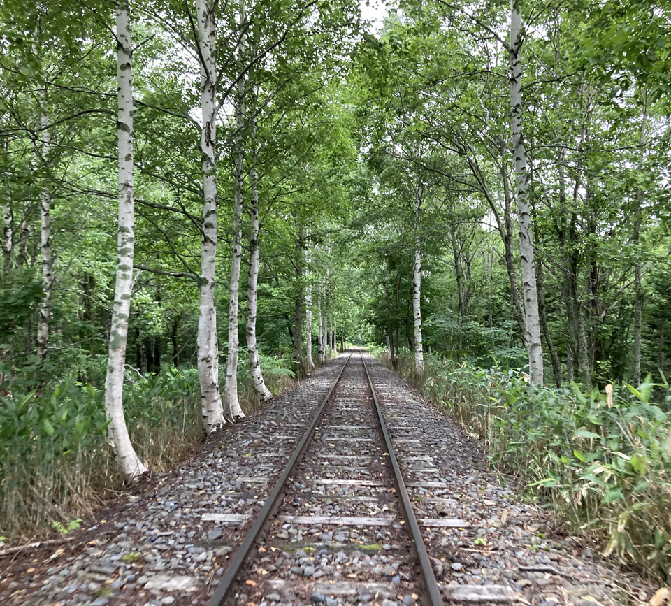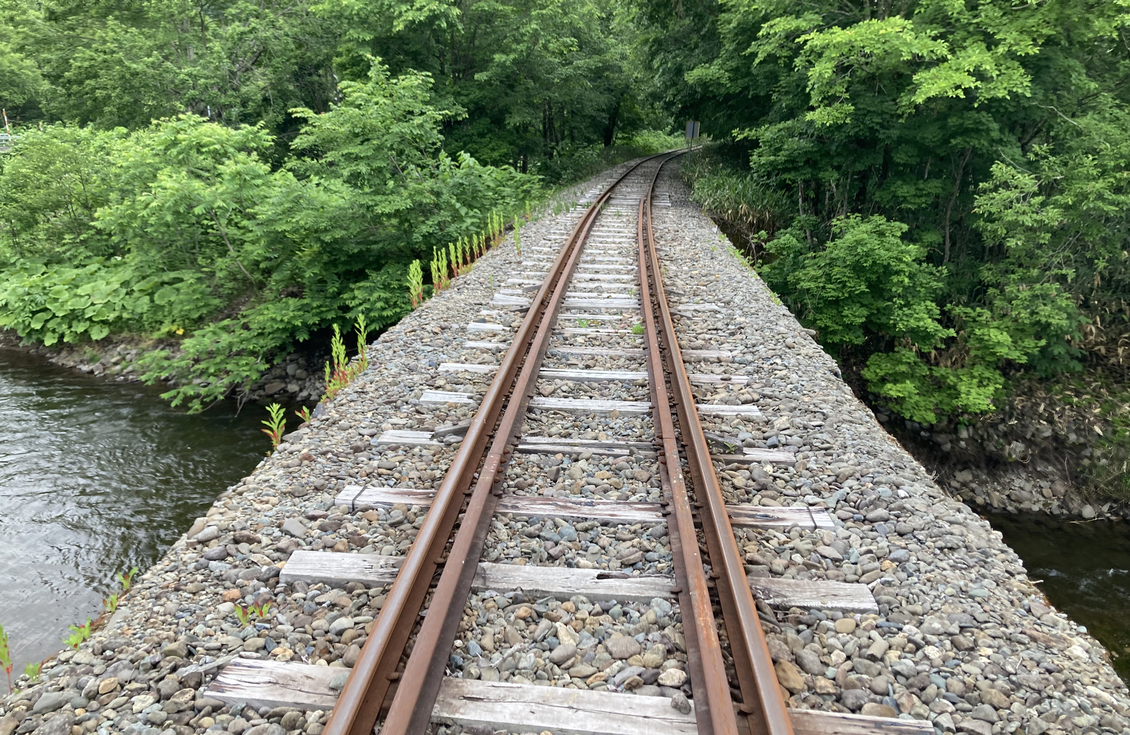 ヒャッヒャ言いながらトロッコを進めていくと、今度は川の上を走る鉄橋が! ここ、線路の脇に柵がないから、安定した北の大地から急に狭くて不安定なところを走っている感覚になって、スリルがある。こんなところを実際に電車が走っていたと考えたら、心臓が少しキュッとなりませんか?