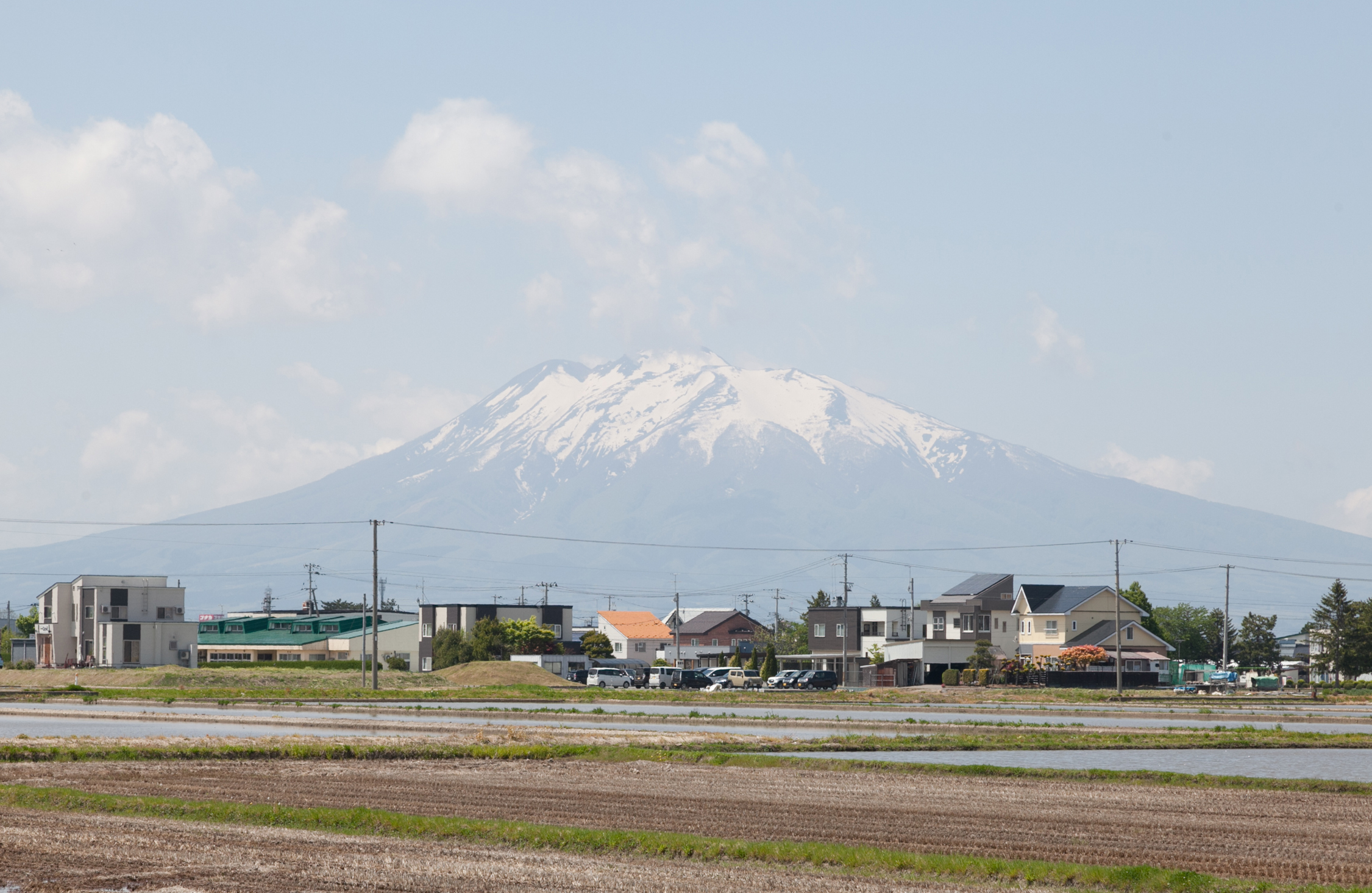 運転して2日目の昼、あと少しで青森市内に入るだろうという道すがら、遠くに美しい独立峰が見えた。あれが岩木山かなあ、と思って車を停めた。