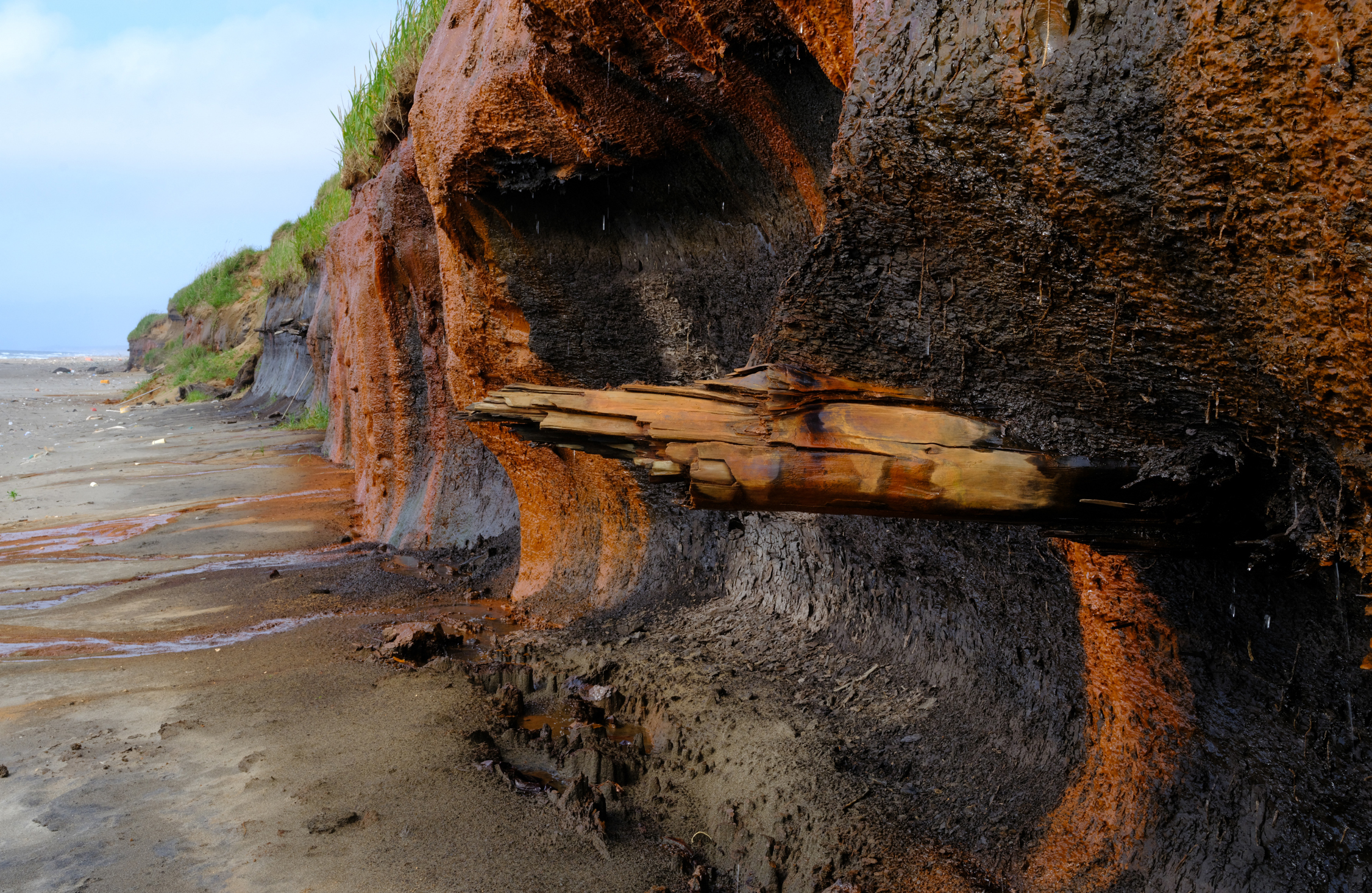 小岩先生が調査している日本海側の海岸線は、常に波浪や強風、雪など過酷な自然の影響、加えて人間社会のさまざまな営みの影響も受けており、短いスパンで地形の変化がわかる場所なのだという。いつも先生に連れて行ってもらう海岸には、そうした変化が大きくあらわれている露頭(地層が露出しているところ)があり、そこを定期的に観察するのだ。この露頭には何万年もの時間が凝縮されていて、はるか大昔の十和田の大噴火の火山灰、北海道の洞爺の火山灰、旧石器時代の人々を絶滅へと追いやった鹿児島・姶良カルデラの噴火の火山灰など、それぞれをはっきりと見ることができる。またここから少し北側にいけば、約3万年前の最終氷期の埋没林が露出している海岸もあった。風と波に大地が削り取られて、こうやって何万年も前の木の化石が、今まさに私たちの眼の前に、姿を現している、というわけだ。