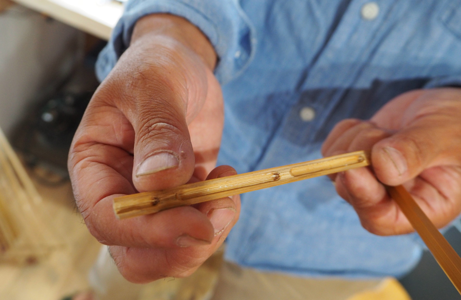 裏表のないまっすぐな性格を表現する竹を割ったような性格という言葉があるが、望月さんによると、鉈で竹を割ると曲がっている。そのまま使うと、竹を削る時に繊維を絶ってしまって竿の強度が弱くなるので、熱をかけてまっすぐにしてゆく。1本に20時間ほどかかるこの「曲げ取り」こそ、望月さんの竿の生命線だという。