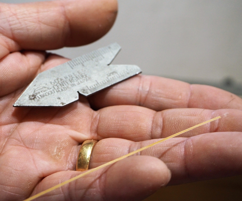 曲げ取りをした竹にカンナをかけ、0.001インチ(0.0254ミリ)単位で三角形に削っていく。それを6本作ってまとめると、一本の六角の棒になる。それをオーブンに入れて176度になると、竹のケイ素という成分が炭化して張りが出る。さらにその六角の棒をテーパー状(径・幅・厚みなどが、先細りになっている状態)に削っていく。竿の先端は、1ミリ強の細さだ。このテーパーの加減や柔らかすぎず硬すぎない竿の強度に、望月さんがフィールドで得た感覚が活かされている。