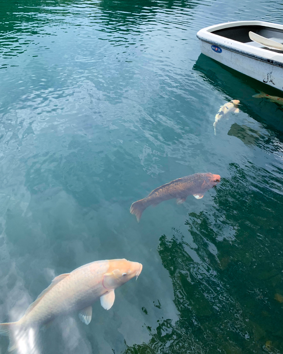 すぐに「ハートの模様がある鯉を見つけると幸せになれます」というようなことが書かれた看板が目に入る。いくらなんでもこんな広大な沼で一匹の見つけられるわけないじゃないか、と思いきや、いきなりボート乗り場のところにハートの柄の鯉がいるではないか!