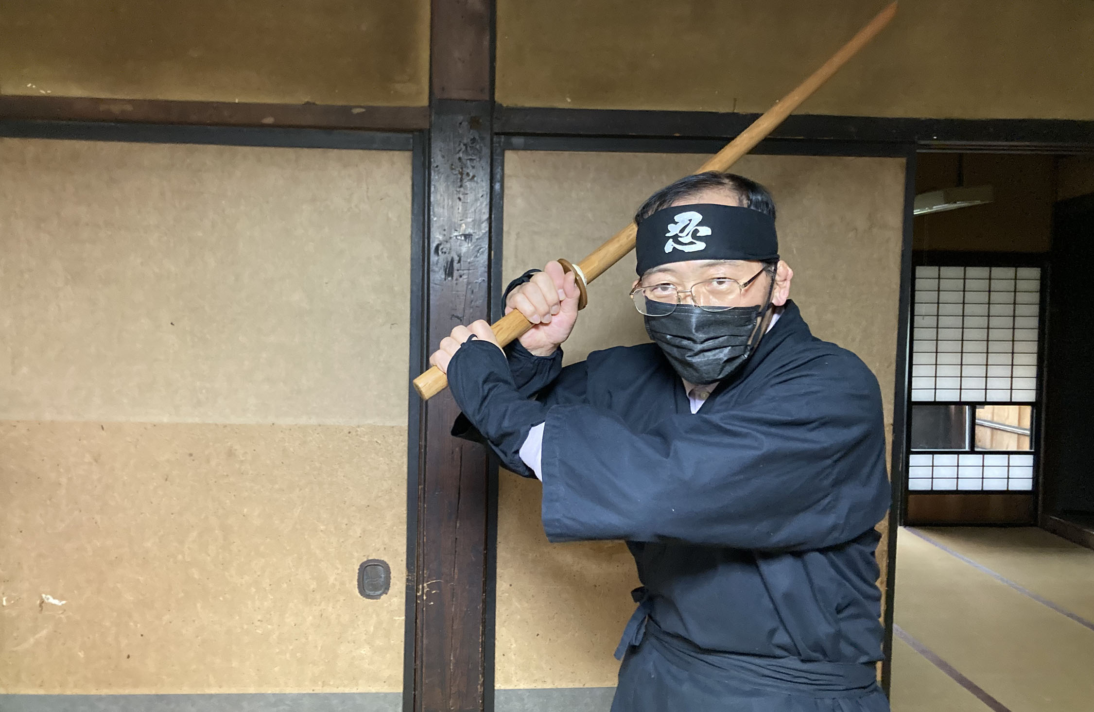 でも、忍者気分は味わいたい。僕は、「着替えていいですか?」と佐藤さんに尋ねた。「忍者の衣装を着たい」と、事前にリクエストしていたのだ。ちなみに衣装レンタルは1000円。もちろん、自腹だ。囲炉裏のある居間で、黙々と着替える。僕だけ着るのかと思ったら、佐藤さんも忍者になってくれた。カメラを向けると、木刀を持ってポーズをとってくれる。気さく!