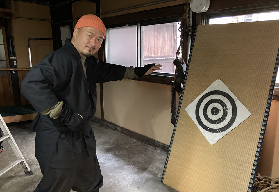 土間には畳が立てかけられていて、穴だらけの的が貼られている。「さあ、やってみましょう」と佐藤さんから手渡されたのは、手裏剣。手裏剣というと海の生物ヒトデのような形をしたものを思い浮かべるだろう。それは「車剣」と呼ばれるもので、僕が手にしたのは鉄の棒の先端が尖っている「棒手裏剣」。