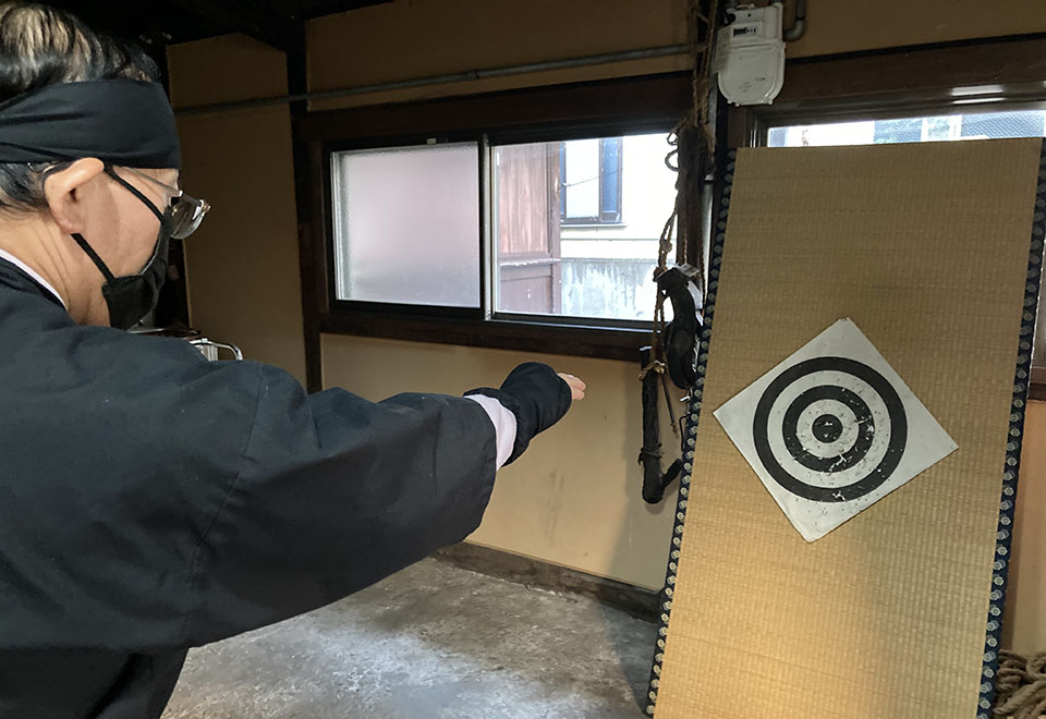 この棒手裏剣が、めちゃくちゃ難しい。中指に沿うように親指で挟み、手を上からまっすぐ振り下ろす。そう教わっているのに、手が野球の投球のように斜めに下りてしまう。そうなると棒が斜めに回転して、畳に跳ね返される。佐藤さんはさすがに慣れていて、ドスッと鈍い音を立てて手裏剣が的に突き刺さると、ニヤリ。泥棒も、この屋敷に侵入するのは避けた方がいい。僕は何度か投げて、一度だけ、的に刺さった。やっぱり、忍者には向いていないようだ。