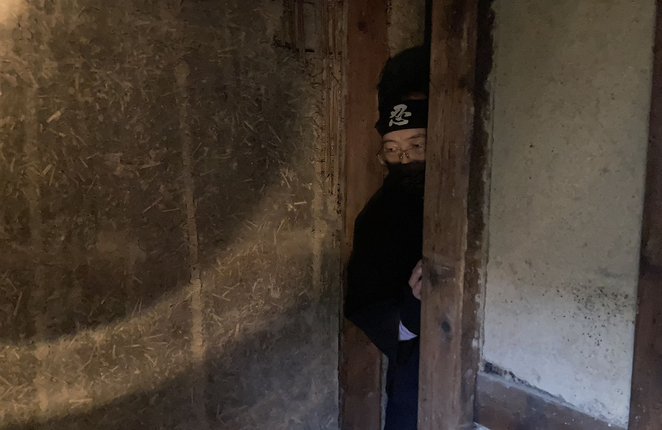 想像してほしい。壁が隠し扉になっていて、その先にある極細の空間に目をギラギラさせた忍者が3人も隠れていることを。怖い! 佐藤さんにちょっと隠れてみてくださいとお願いしたら、なにも言わず、その空間にスッと入り込み、顔だけだしてくれた。笑顔はない。その瞬間、忍者が佐藤さんに憑依したように見えた。